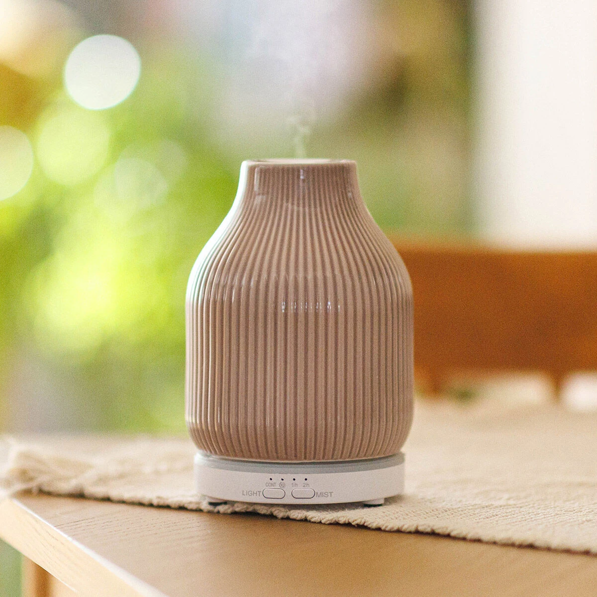 This sleek and modern ornamental piece has a curvaceous taupe-coloured ceramic exterior with a ribbed surface, and it looks fabulous on your shelf or mantelpiece, complementing any home décor scheme. The LED light at the base emits a subtle glow, adding a warm ambience to any room.
