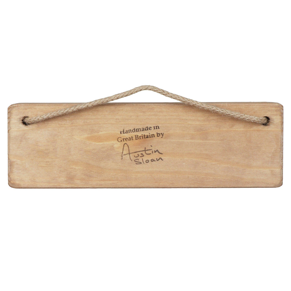 Handmade in the UK, this long sign is formed from a solid block of wood that has been painted with black text. The rope on the reverse means that you can hang it from your wall or door with ease. Lacquered for longevity, this sign is perfect for indoor and outdoor use.