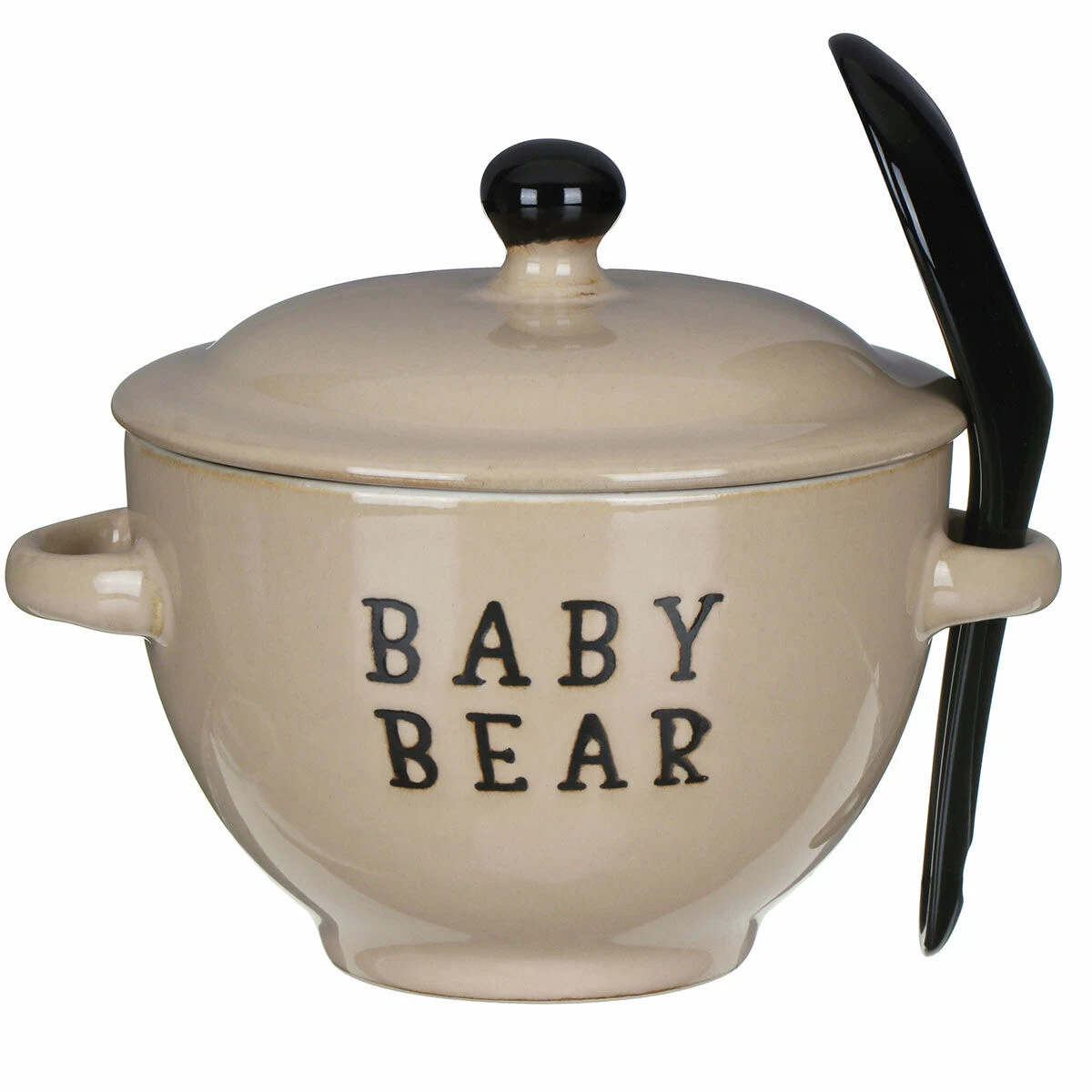 This bowl is fashioned into the style of a mini casserole dish, offering a handle at both ends, and a removable lid with knob on top. Coated in a taupe glaze, this bowl features the words ‘BABY BEAR’ debossed into both front and back on the piece.