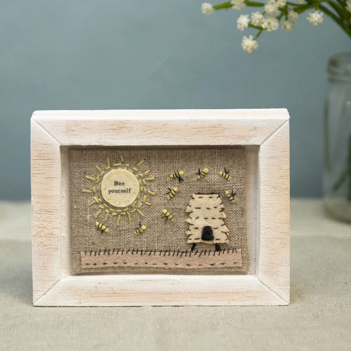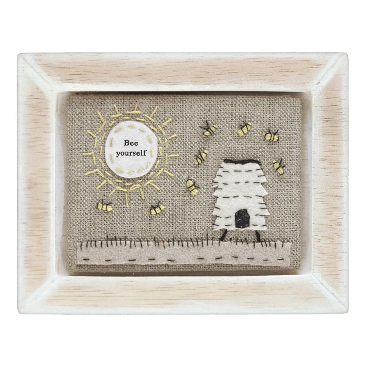 Displaying a canvas picture embellished with felt patches and embroidered details, this gorgeous white wooden frame from East of India makes a wonderful decorative addition to any home. The scene features a beehive in a field, surrounded by bumblebees, with the sun shining brightly in the sky. Inside the sun are the words ‘Bee Yourself’, written in a vintage typewriter style font.