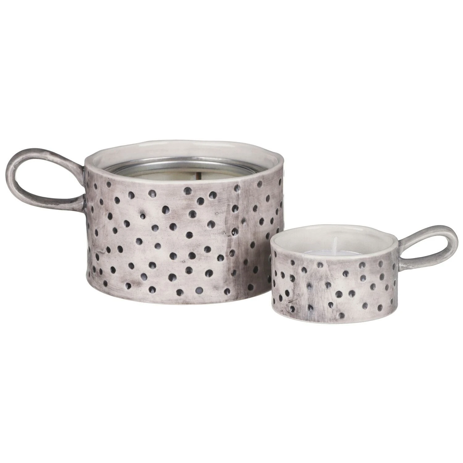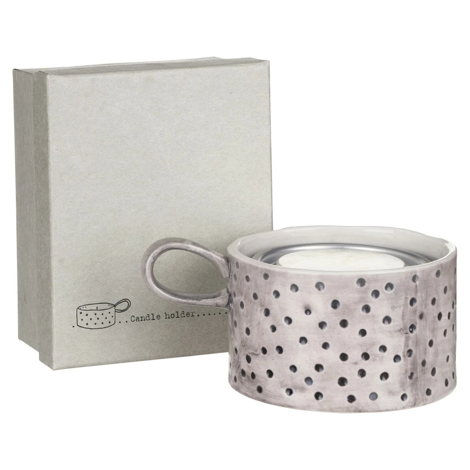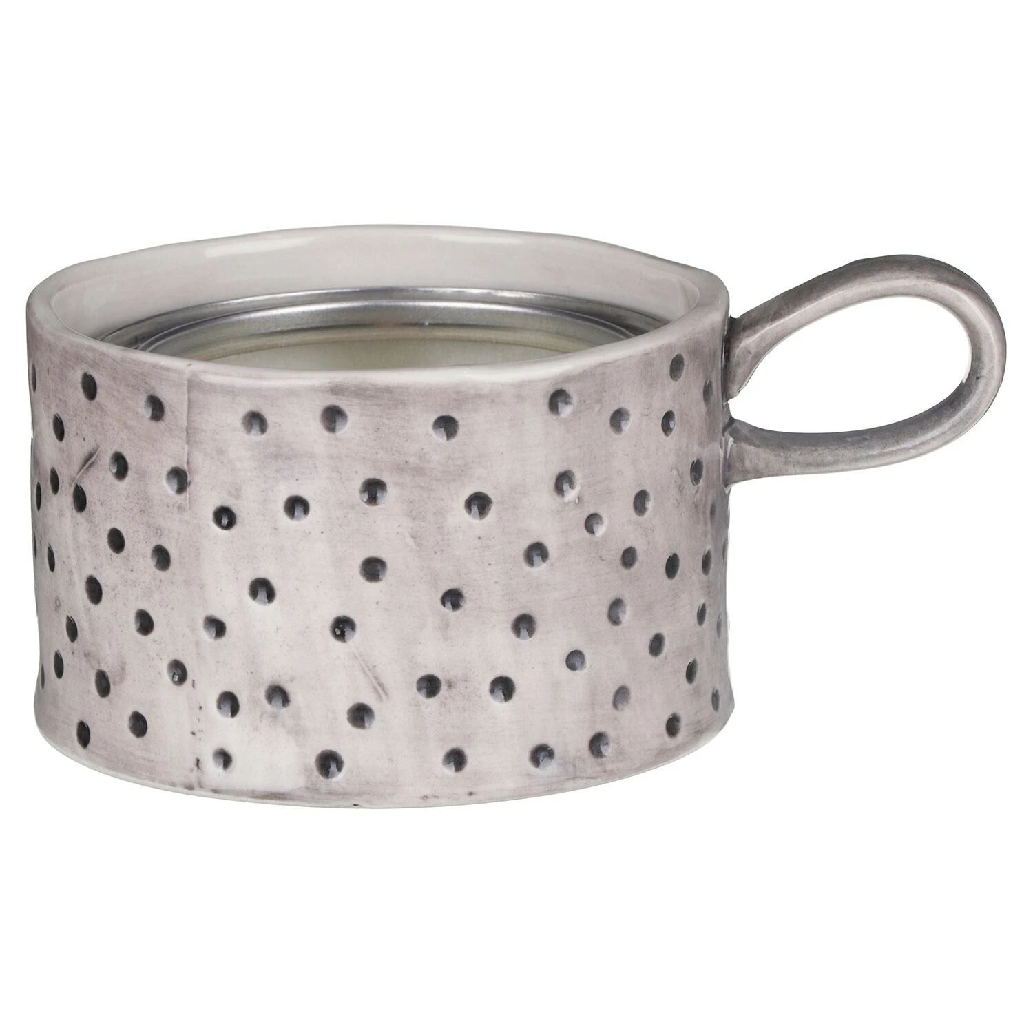 This taupe ceramic candle holder is coloured washed taupe and features polka-dots, etched into the surface in a freestyle fashion so each one is unique. Included with this ceramic vessel is a Lemon and Thyme scented candle, which comes in a tin to sit perfectly inside, with a burn time of 14 hours, that will create a relaxing ambience.