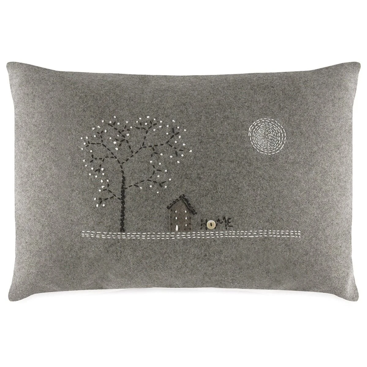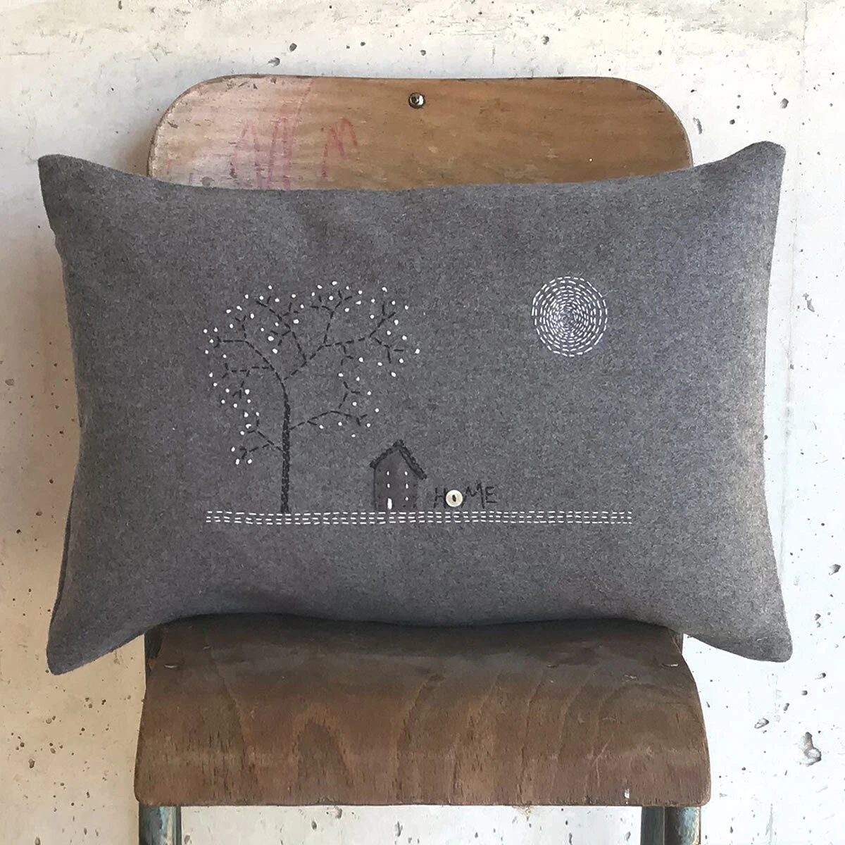 This handmade cushion is rectangular in shape, feather filled and made from wool. Dark grey in colour, this cushion features white and black stitching on the front with an image of a tree and house. It is ideal for displaying around your home.