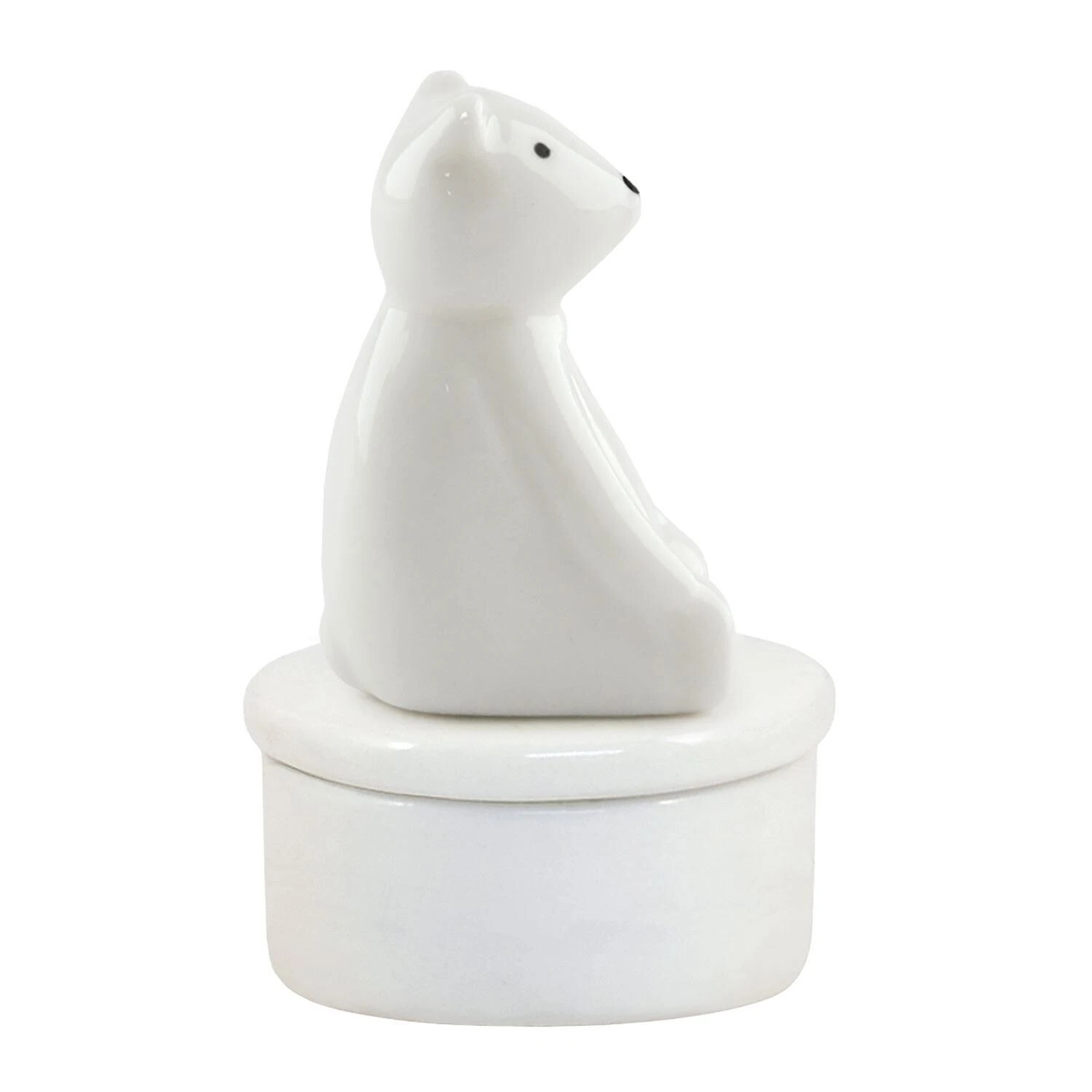 This small porcelain pot is cream in colour with a smooth finish and black dots for eyes and nose, this cute ice-white bear sits upon a small lid to a miniature trinket pot.