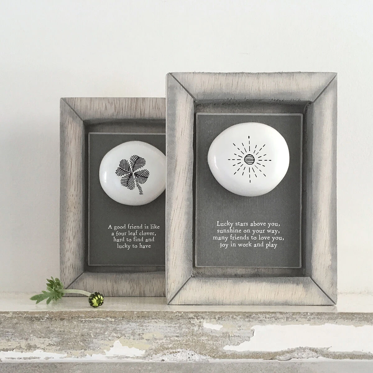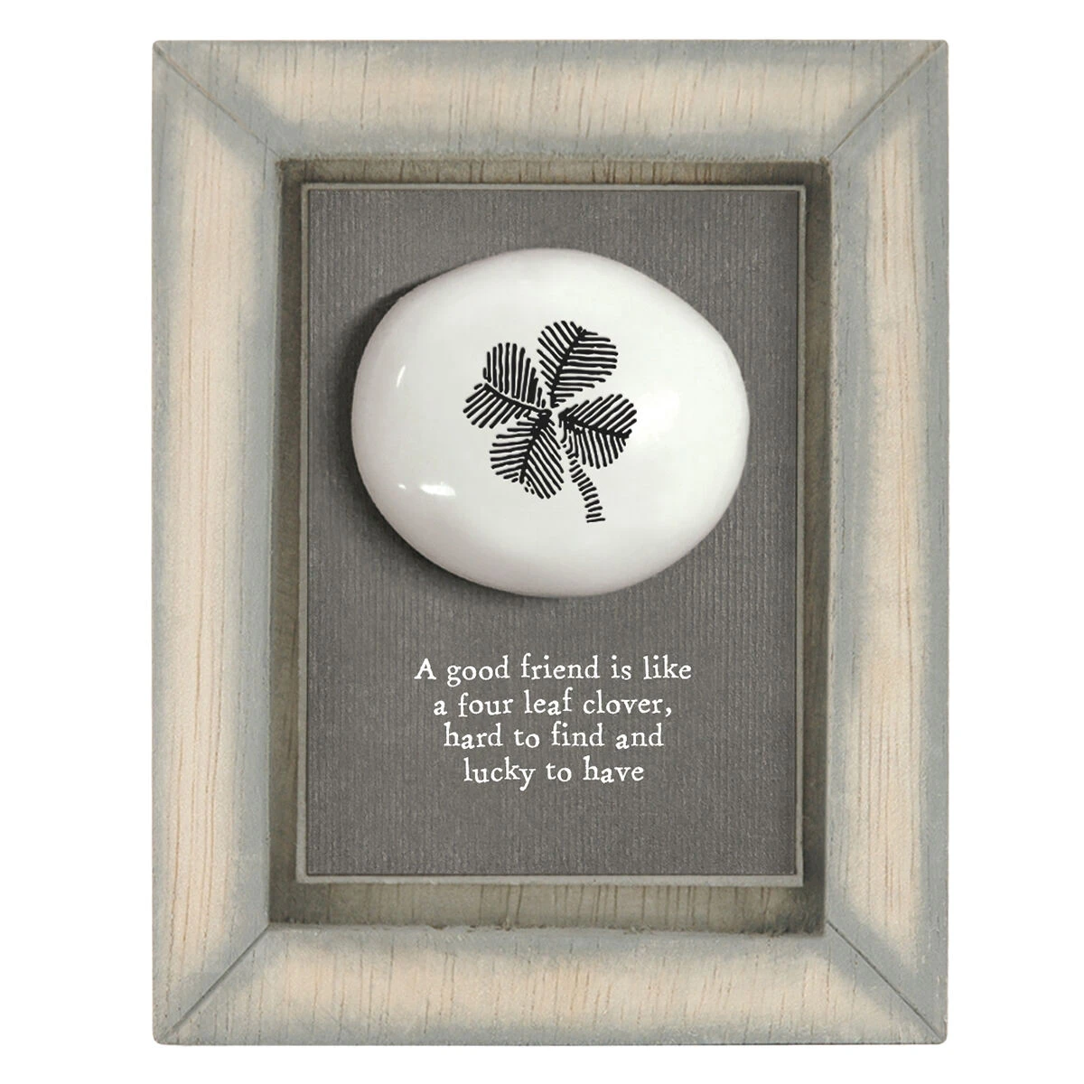 Display this canvas picture embellished with a grey felt block in your home for a wonderful decorative addition. Adorned with a white shiny ceramic pebble with a striped four leaf clover. The gorgeous washed grey wooden frame from East of India is sure to look amazing in any home. Underneath the design are the words ‘A good friend is like a four leaf clover, hard to find and lucky to have’ written in a vintage style font.