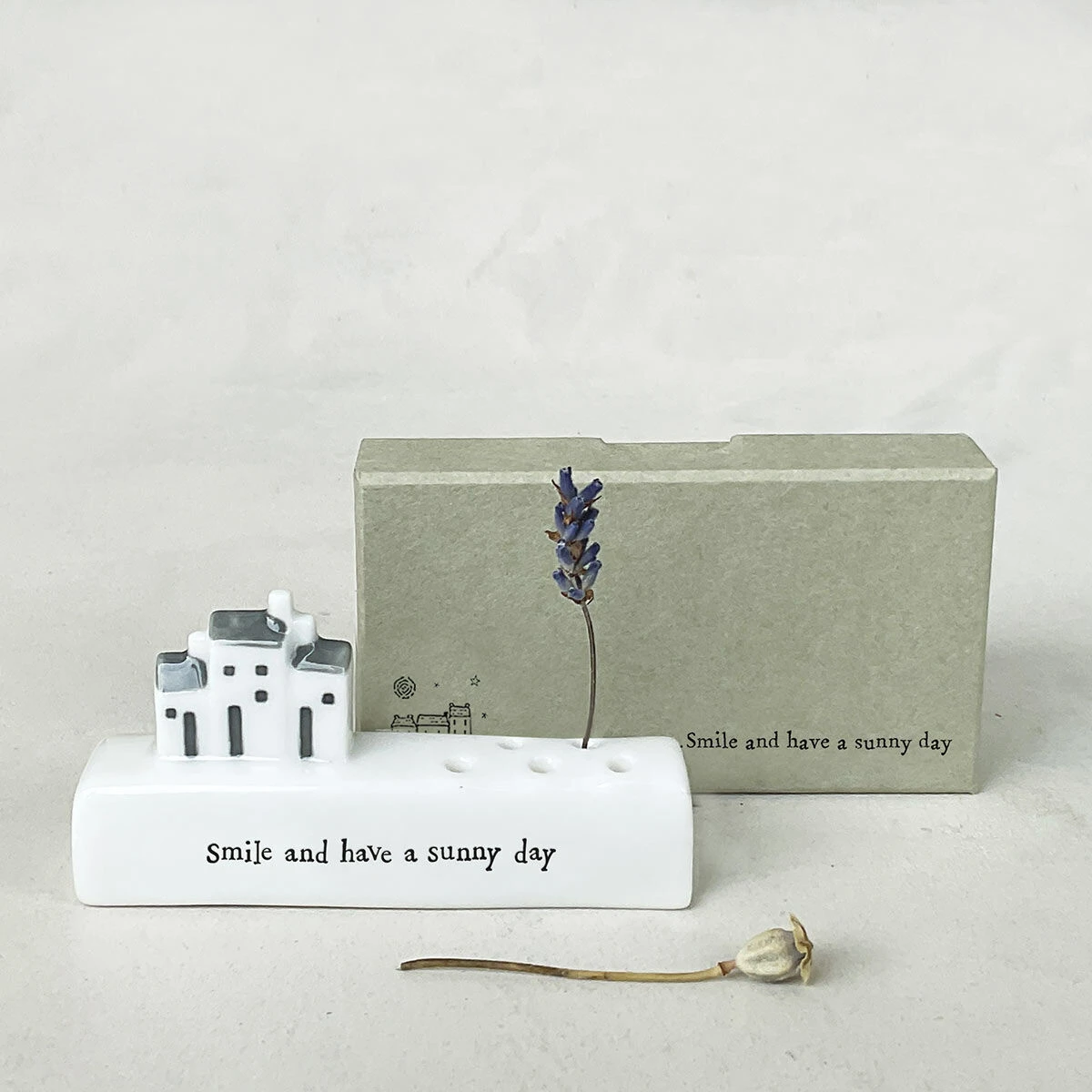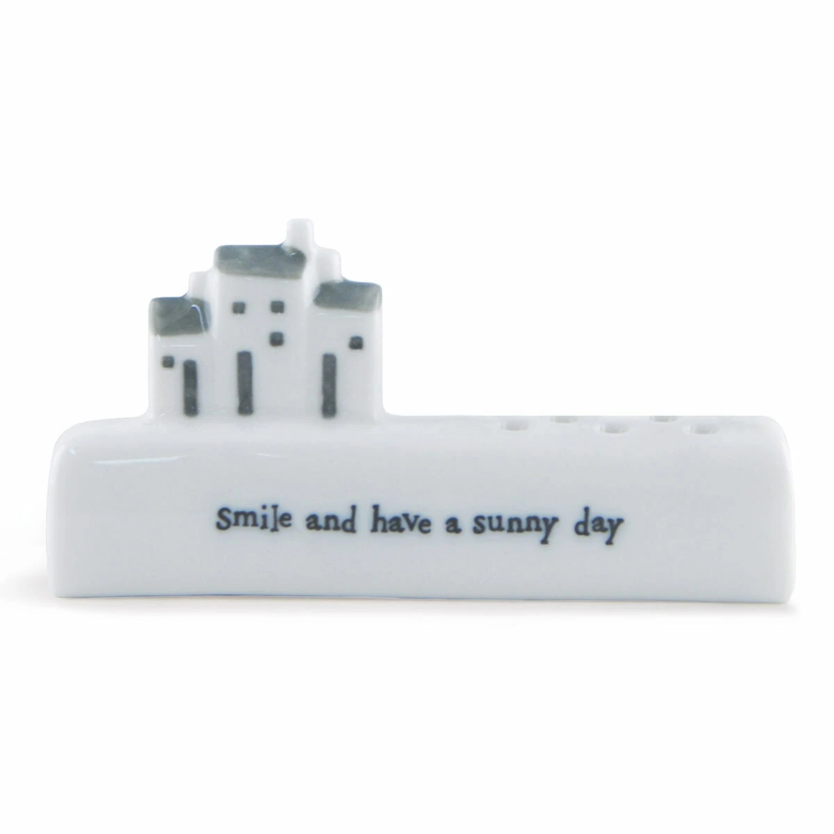 This wonderful decoration from East of India features three small houses above text which reads ‘Smile and have a sunny day’. Next to the houses are small holes which is perfect for placing incense sticks or small flower buds.