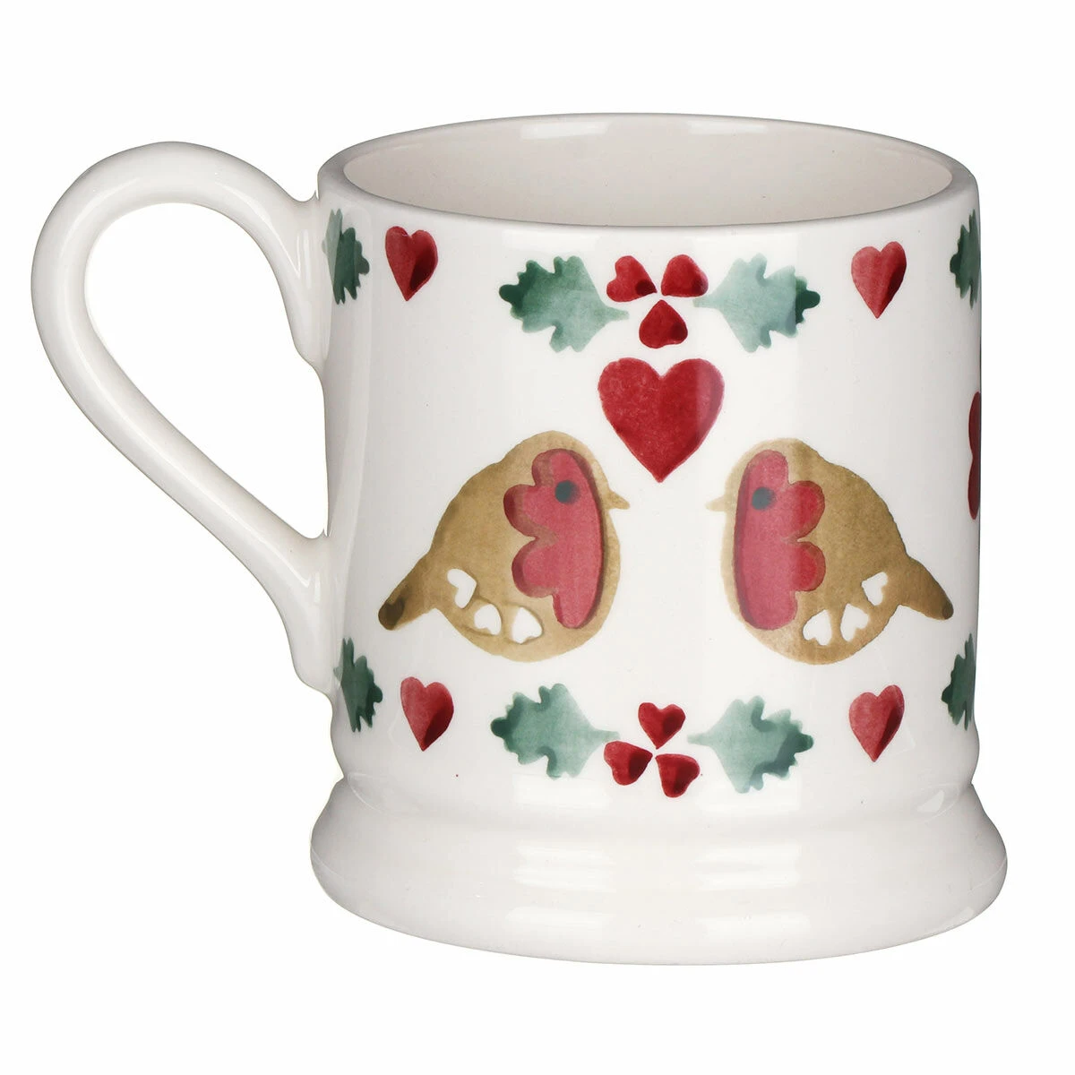 This beautiful half pint mug from Emma Bridgewater is decorated with the Christmas Joy design in red, brown, and green. Decorated with a pair of red breasted robin and a leaf motif which repeats around the rim, top and bottom, spaced with red hearts creating a festive border.