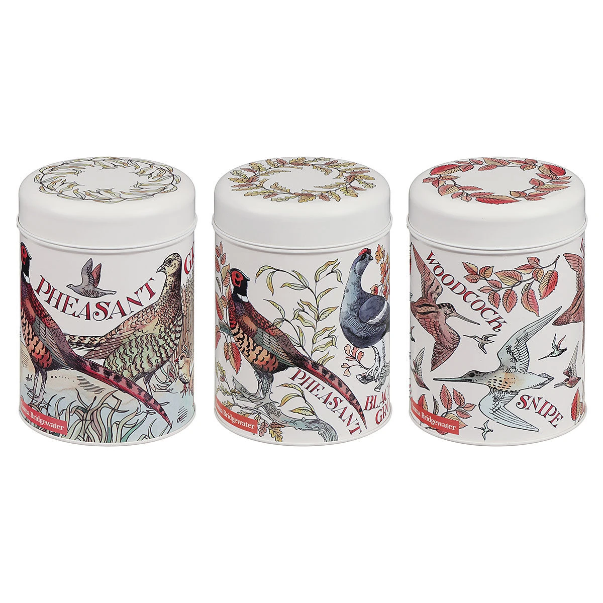 Bring countryside colours to your kitchen with this Game Birds set of three tin storage caddies in the Emma Bridgewater Game Birds design, presented in a display box, measuring 33cm wide x 16cm high x 11.5cm deep.