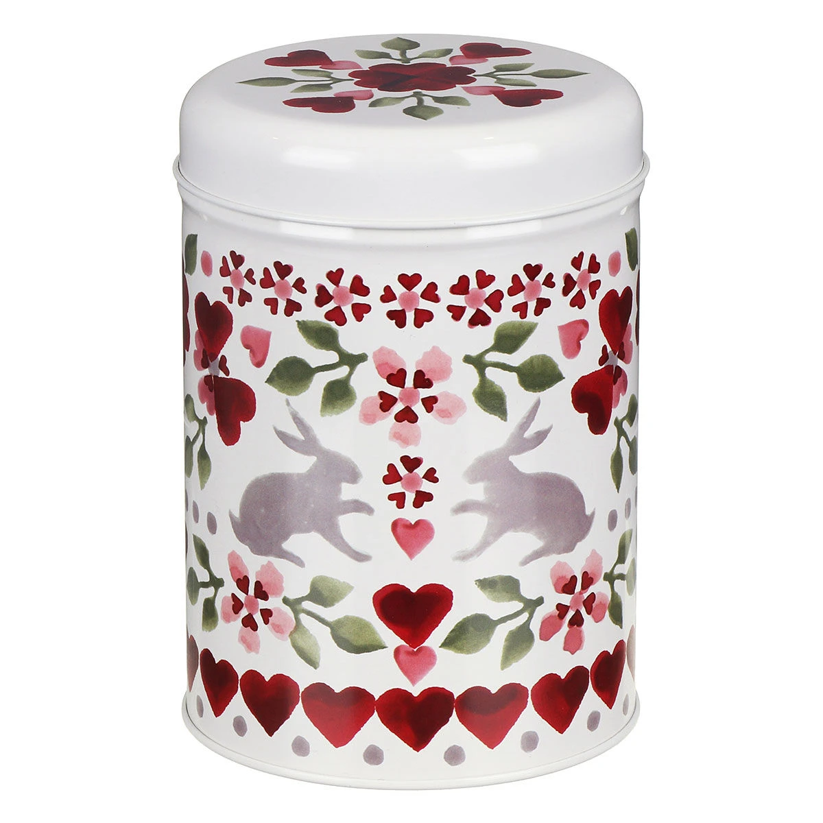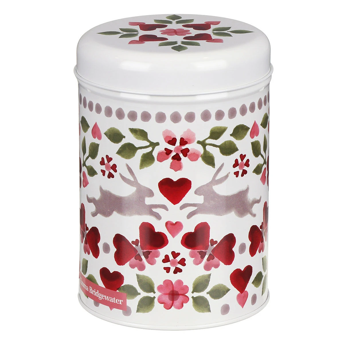 Each round caddy is adorned with a beautiful design featuring hues of grey, red and green. The stunning designs showcased throughout the piece feature the magnificent Lovebirds sponge printed design. Two of the tins feature pairs of hares and the third a pair of birds, they sit surrounded by a flower motif in pink and green, along with a scattering of hearts. The simple pink and red floral motif is accentuated by butterflies and green foliage which tie in with the design. The tins are a soft cream in colour, creating a wonderful base for the design.