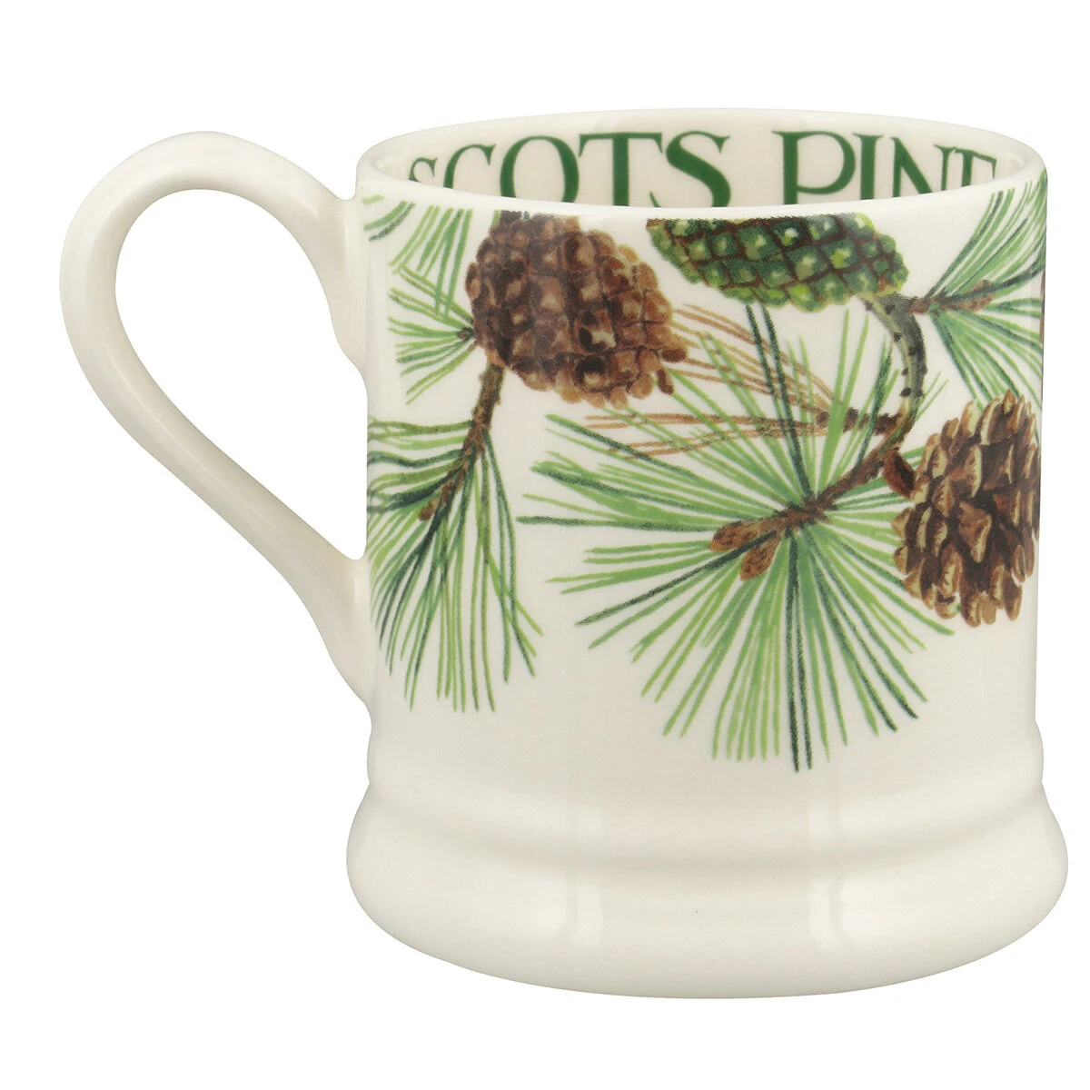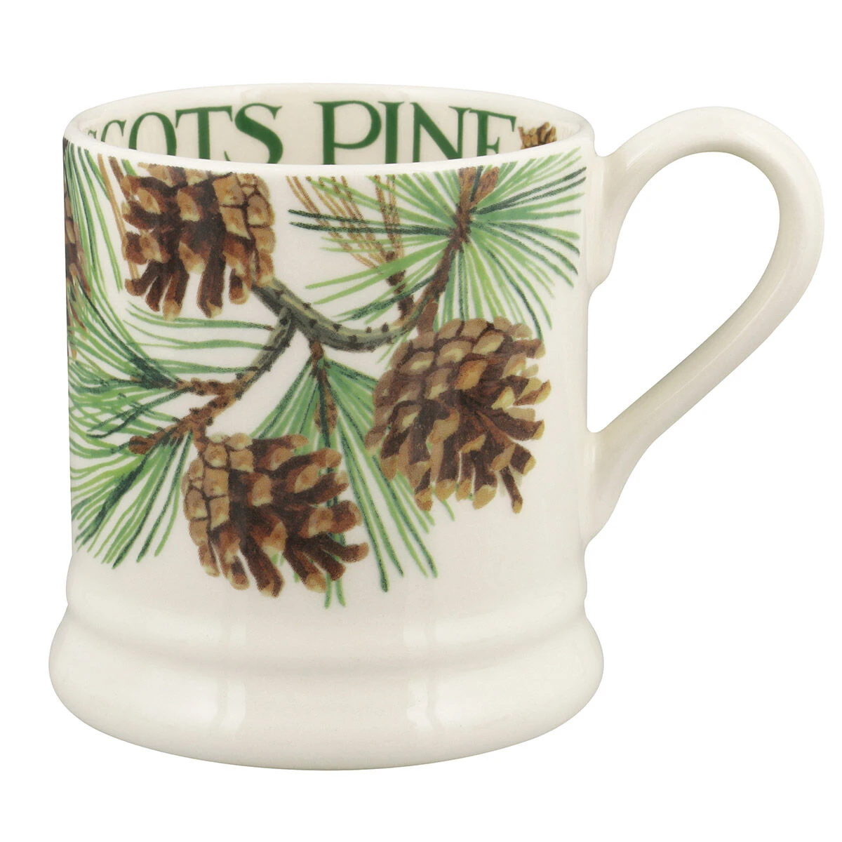The half pint mug features a beautiful, illustrated design of branches of a pine tree complete with its pinecones. The image depicts branches of the evergreen conifer adorned with dainty green pine needles and striking pinecones. The natural design is set against the cream ceramic earthenware, allowing the design to look truly striking. Inside the rim of this mug the design continues with the word ‘SCOTS PINE’ written in a stylish uppercase font, along with a single pinecone.