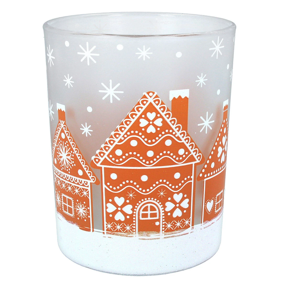 Simply place a candle in the holder and watch as your home is filled with the soft glow of candlelight. Made from frosted glass, this decorative piece is embellished with a row of gingerbread houses decorated in frosty-white icing and surrounded by snowflakes. Place it on a shelf or mantelpiece to admire it all winter long.