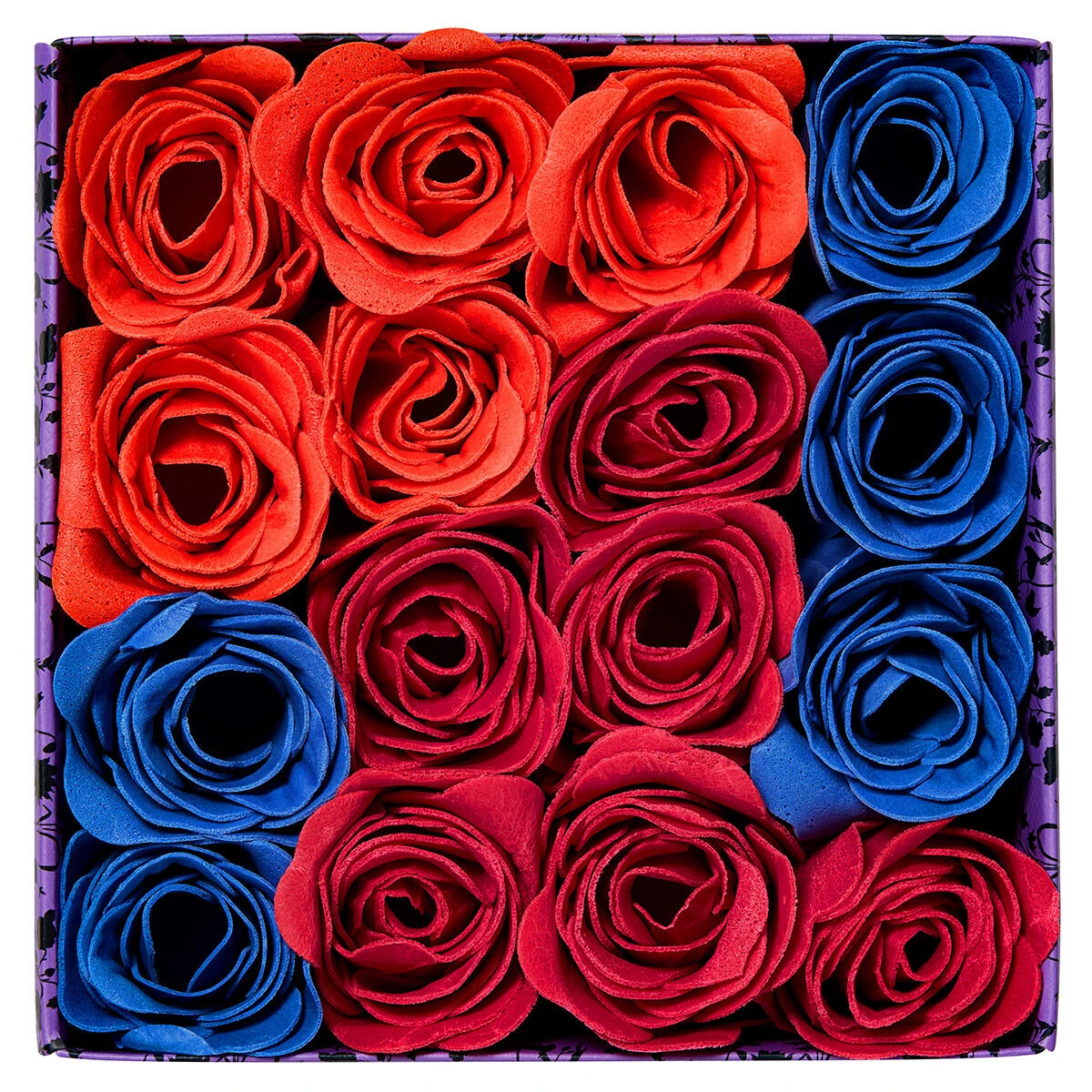 These artistically crafted bathing flowers are delicate blooms in a variety of sizes, made up of petals of soap. They use a beautiful pallet of blue and red shades. As the petals start to dissolve in the warm water you will smell a fresh fruity bouquet of eucalyptus, lavender and patchouli essential oils that are perfectly complimented by fresh green leaves, delicate lily of the valley and warm sandalwood that will relax and revitalize you.