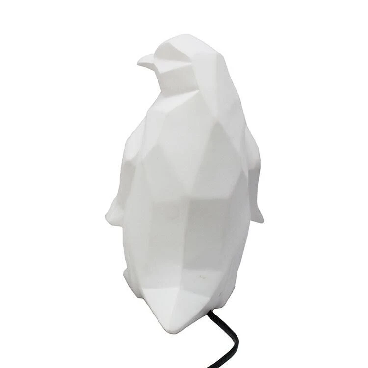 The lamp is made from translucent polyresin and combines clean cut lines and cubist shapes to create a striking sculpture of a penguin. It has an LED bulb within which is powered using a black cable with switch and a 3 pin UK standard plug.