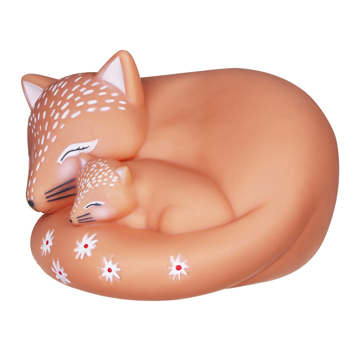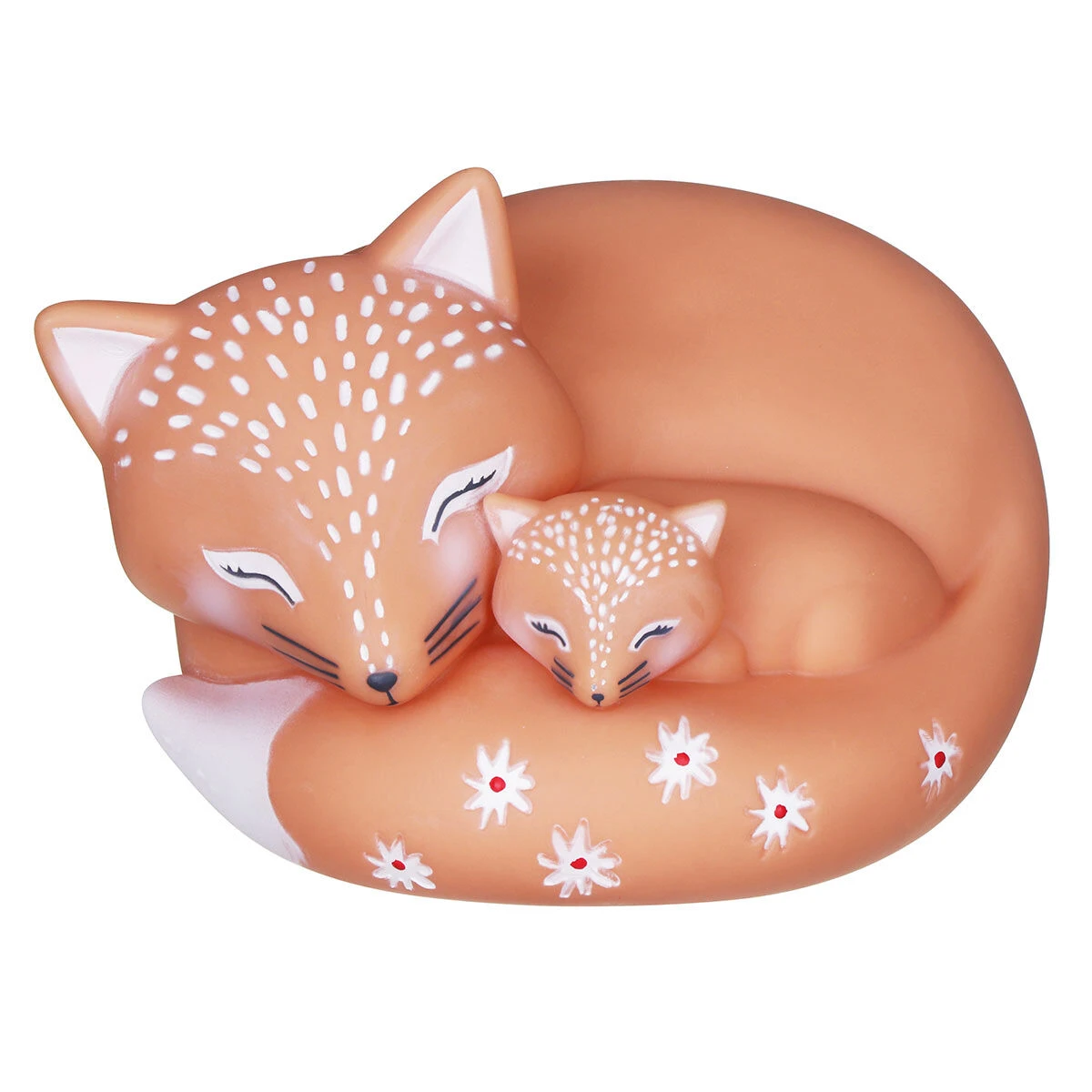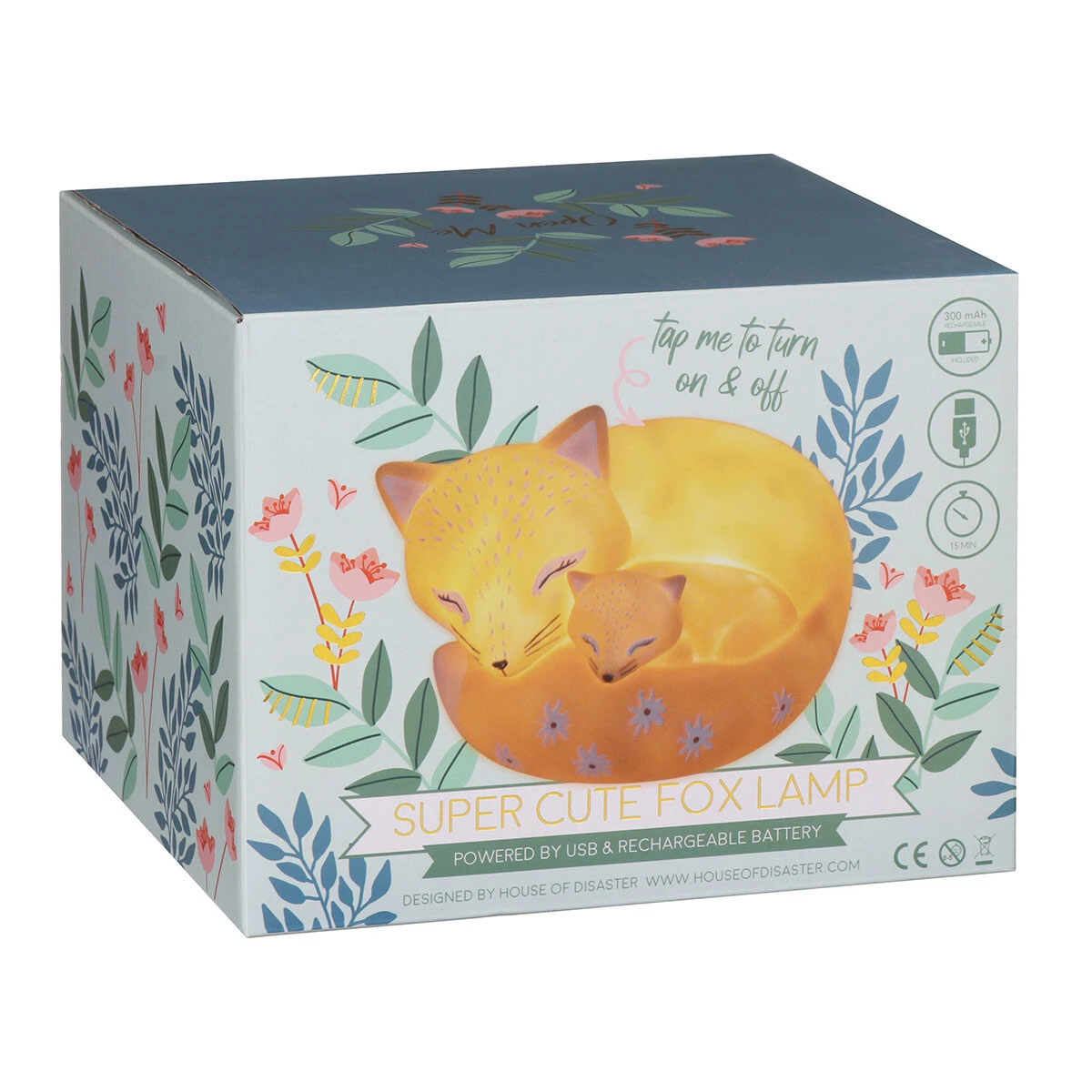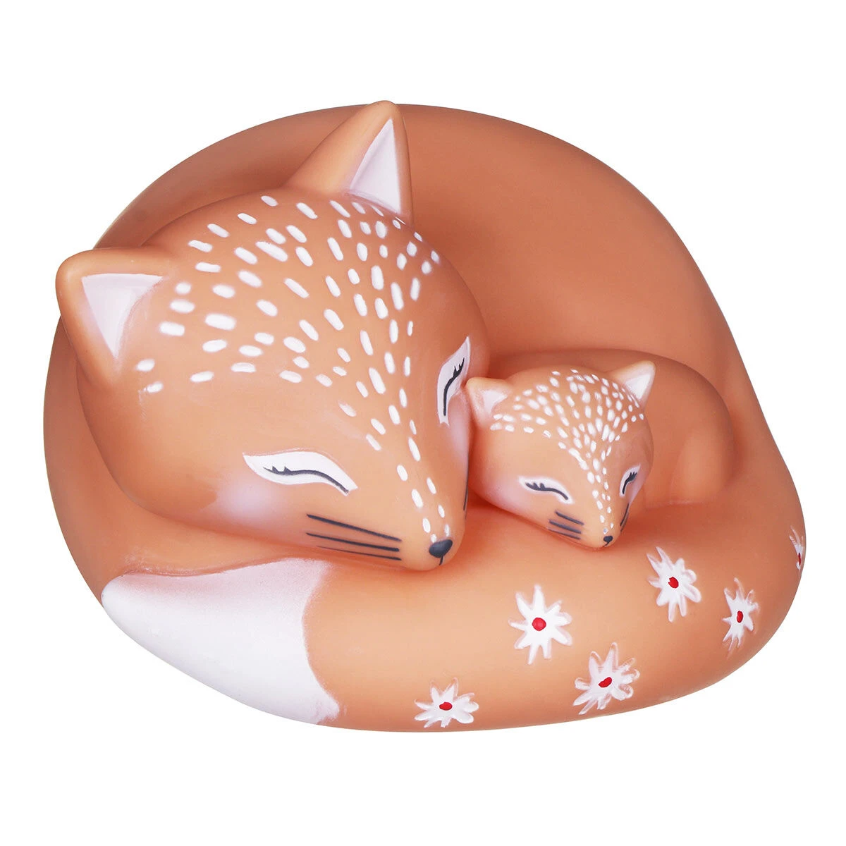 This lamp features a mother fox who is curled up tight with her cub tucked in her tail, both having a nap. Both foxes are adorned with white markings on their faces and the mother even has dainty white flowers on her tail creating a truly delightful design.