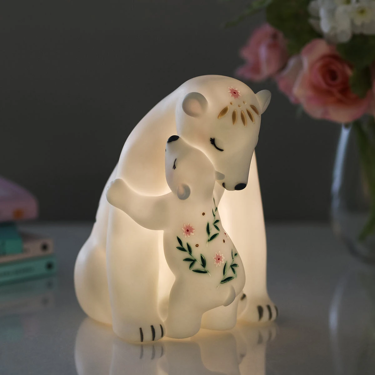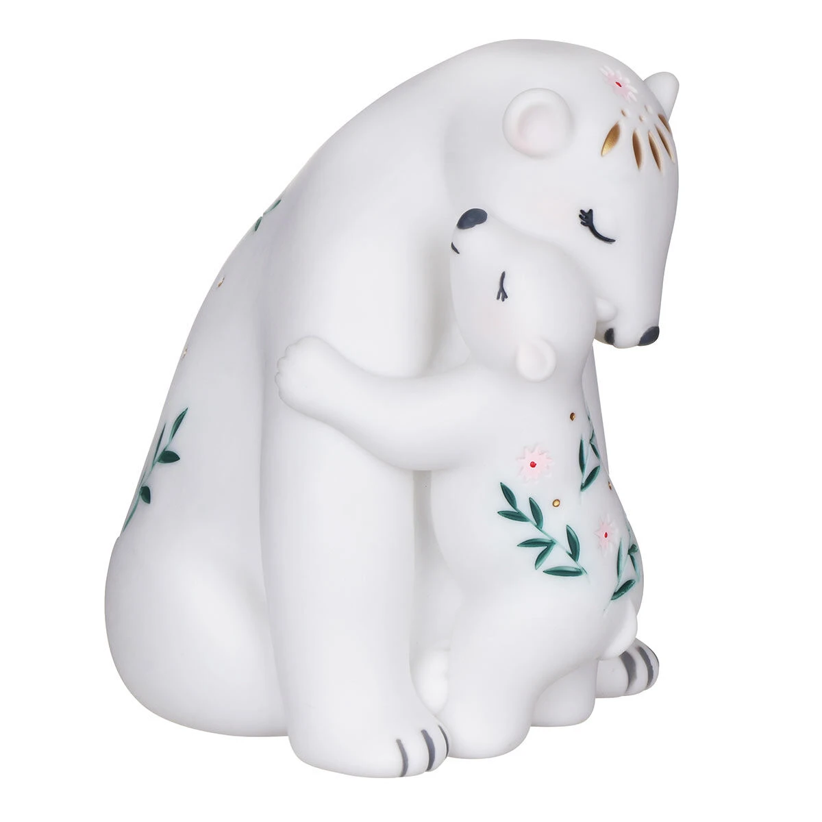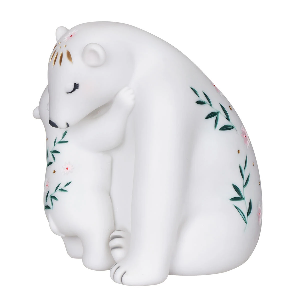 This lamp features a mother polar bear who is sat looking down on her cub, embracing her in a loving hug. Both polar bears are adorned with a floral and foliage motif on their backs and the mum has decoration on her head to, creating a truly delightful design.
