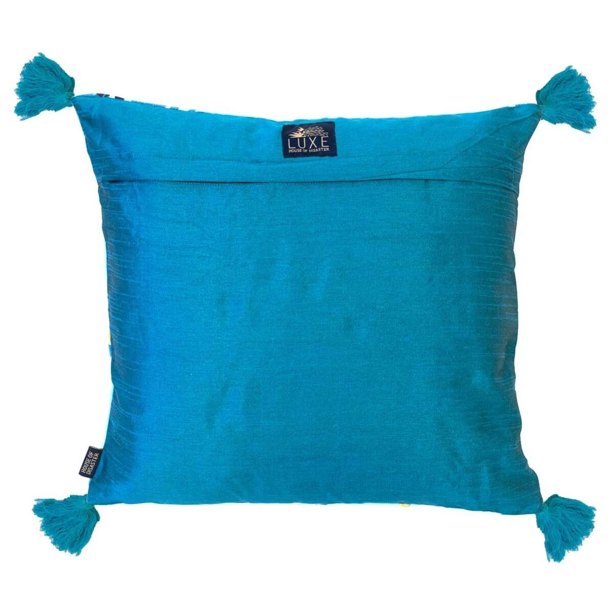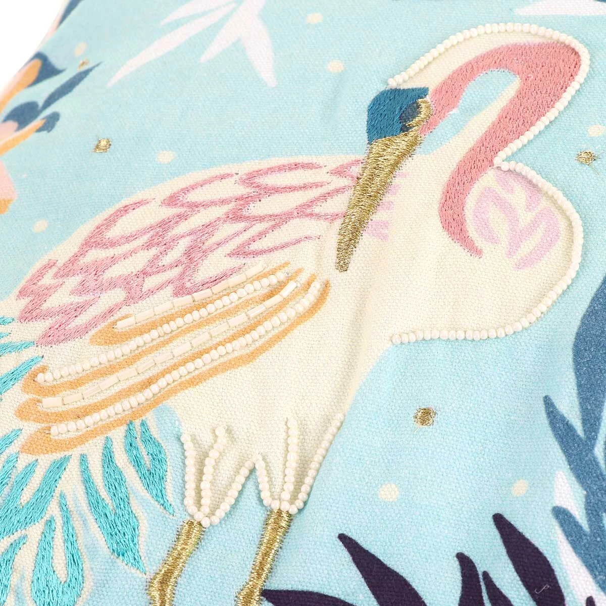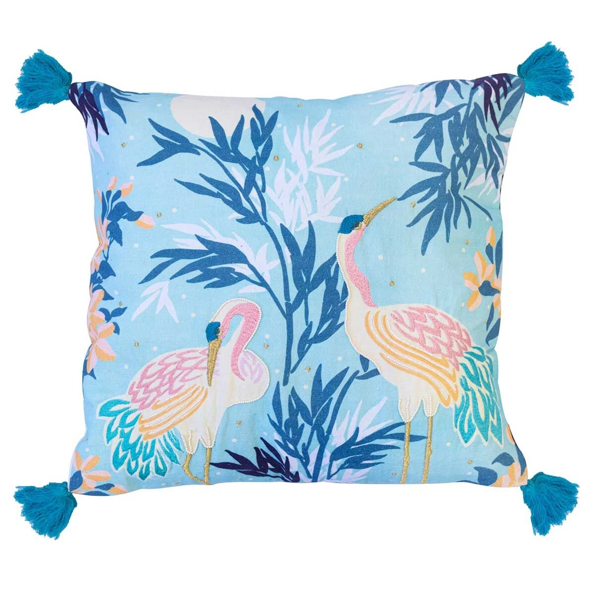 The crane cushion is vibrant blue poly-cotton with a gorgeous embroidery on the front of two majestic cranes with long legs and beautiful plumage and beaded detailing. These magnificent birds sitting amongst delicate white and blue foliage with the sun overhead. The design is complete with pink detailing along with blue tassels on each corner.