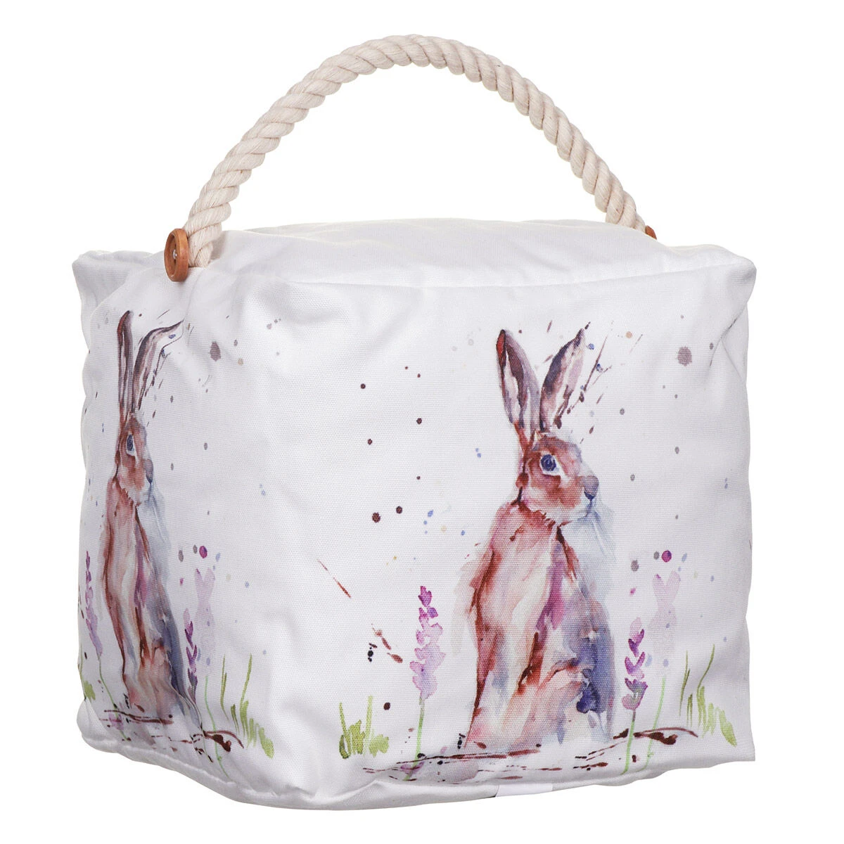 The sides of this square doorstop are decorated with a stunning illustration of a hare who is sat with its ears pricked, surrounded by gorgeous purple flowers. The design is painted in a watercolour style with neutral shades of brown and cream which contrasts beautifully with the crisp white background. Attached to the weighted doorstop is a twisted cream rope handle with neutral button detailing, allowing you to pick it up and move it with ease.