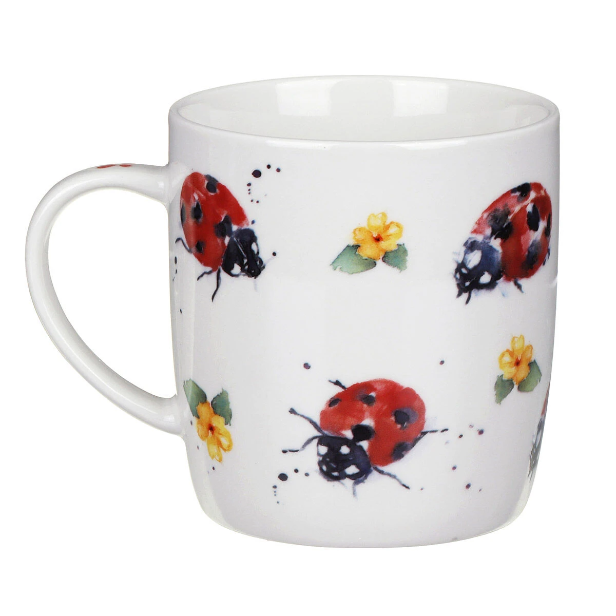 Each mug is made from ceramics and has a capacity of approximately 400ml, more than enough space to hold your hot beverage of choice. The mugs each feature a unique illustration of spotted ladybirds interspersed with dainty yellow flowers which repeats on the reverse. Painted in a watercolour style, the illustration contrasts beautifully with the crisp white background of the china.