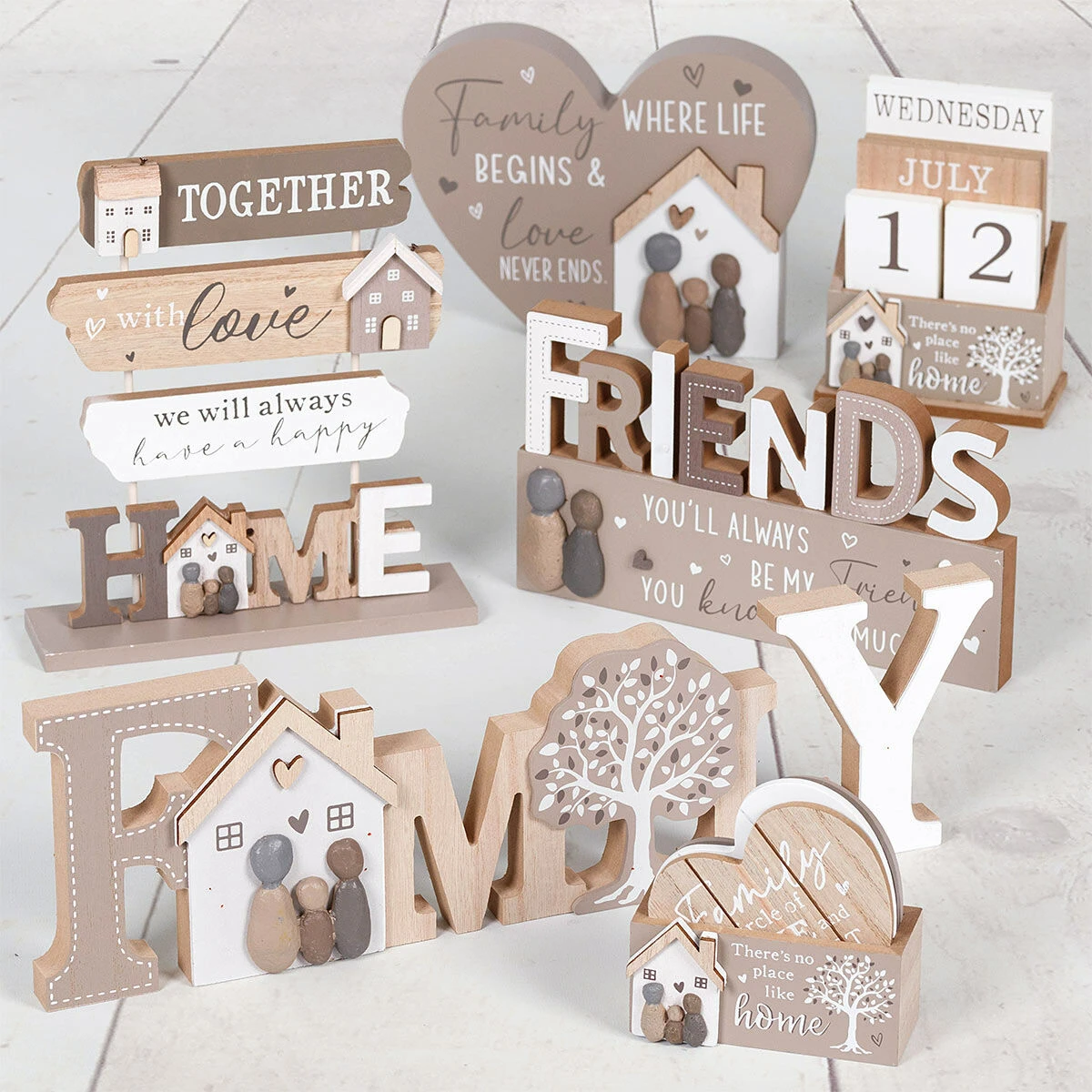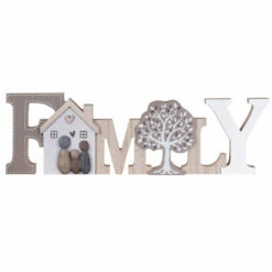 The sign consists of large brown and grey letters is made from wood and features the word ‘Family’. the letter ‘A’ is in the shape of a house with a small family made from pebbles. The letter ‘I’ is in the shape of a white tree.