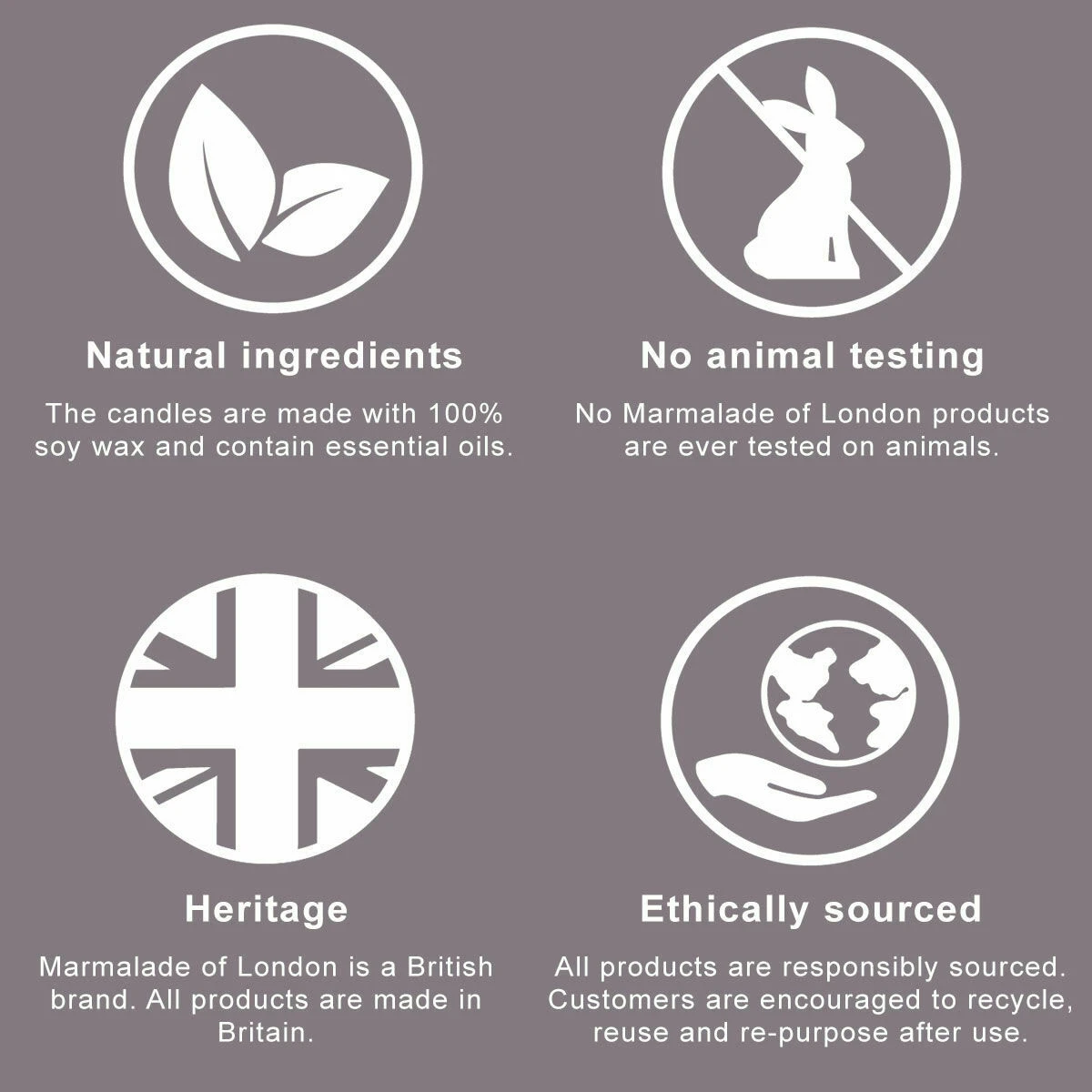 Marmalade of London is a luxurious British brand, with all of their candles being handmade using ethically sourced materials in a purpose-built, eco-friendly factory in the Cotswolds. Customers are encouraged to recycle, reuse and re-purpose after the use of each candle or reed diffuser to promote sustainability. The candles are made from natural ingredients – 100% soy wax, which burns for up 50% longer than paraffin candles, and essential oils. Each candle is made in small batches to protects the top notes of the fragrance which are lost in high volume production. Marmalade of London never test any of their products on animals.