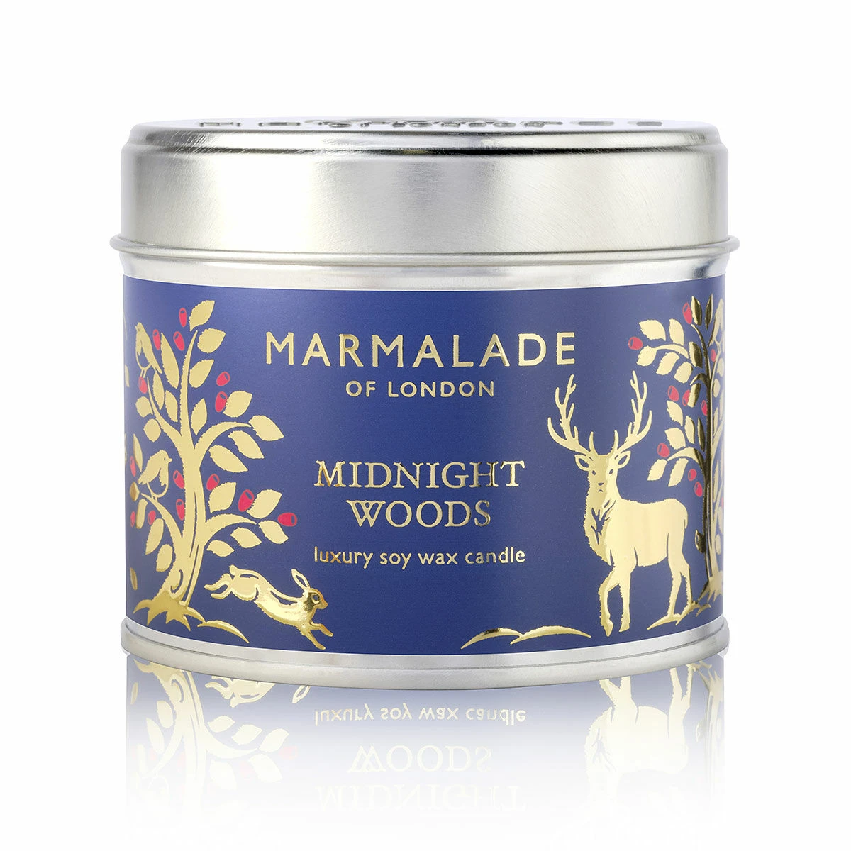 The silver tin vessel is decorated with a gorgeous, midnight navy label that features the Marmalade of London branding, which is also displayed on the lid. Decorated in luxurious gold foiling across the front of the label is a wonderful wintery scene of opulent gold trees, laden with red berries, surrounded by wildlife such as reindeer, robins and more.