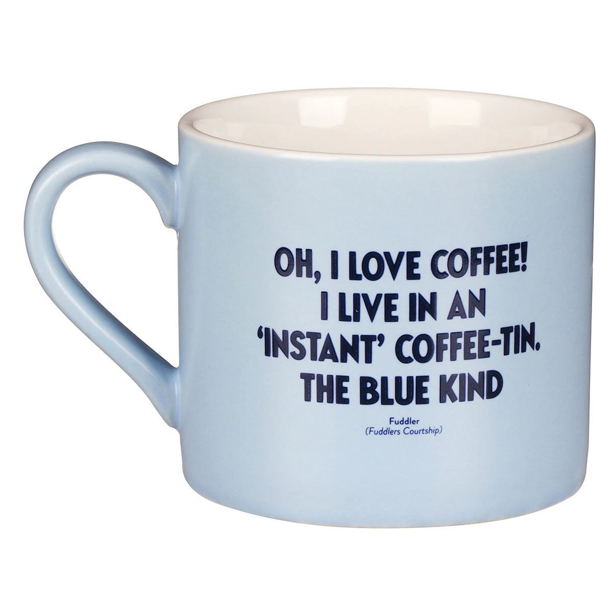 On the reverse of the ceramic mug is the title ‘Oh, I Love Coffee! I live In An ‘Instant’ Coffee-tin. The Blue Kind’ written in a bold uppercase font. Below in a small font are the words ‘Fuddler (Fuddlers Courtship)’.