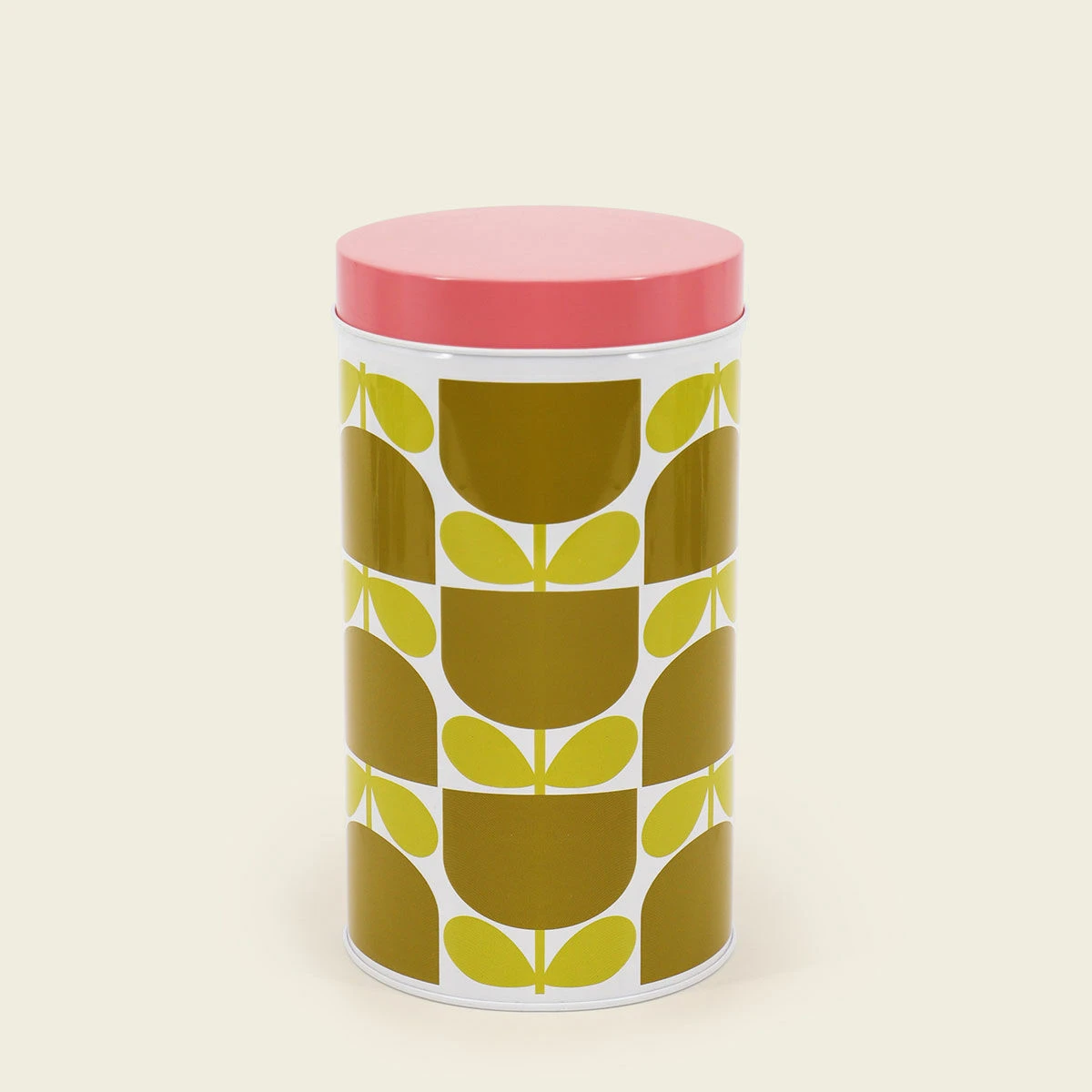 These stunning canisters feature the ‘Block Flower’ pattern; simple tulip style flowers with 2 leaves repeat up and down, all set against a crisp white background. These beautiful sixties style prints come in three different colourways: navy, ochre and fern. Each metal tin is topped with a secure lid in a complimentary solid block colour, orange on navy, pink on ochre and blue on fern.