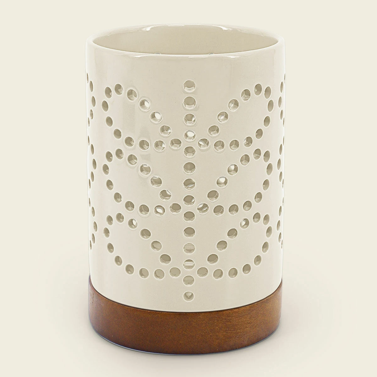 This glossy cream candle holder features a pattern of holes in the ‘linear stem’ design; three pairs of leaves along a vertical stem which is repeated around the whole cylinder. The holes around the edge allows a gentle glow of light out, giving a calm and peaceful atmosphere. The ceramic candle holder features a stepped base which sits neatly into a dark wooden base to finish this charming retro inspired candle holder! This stunning lantern is suitable for a pillar candle.