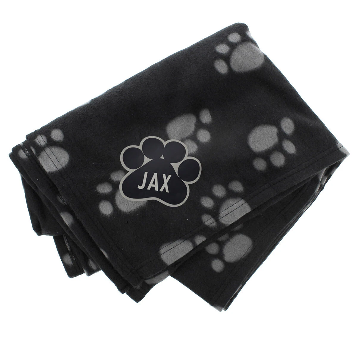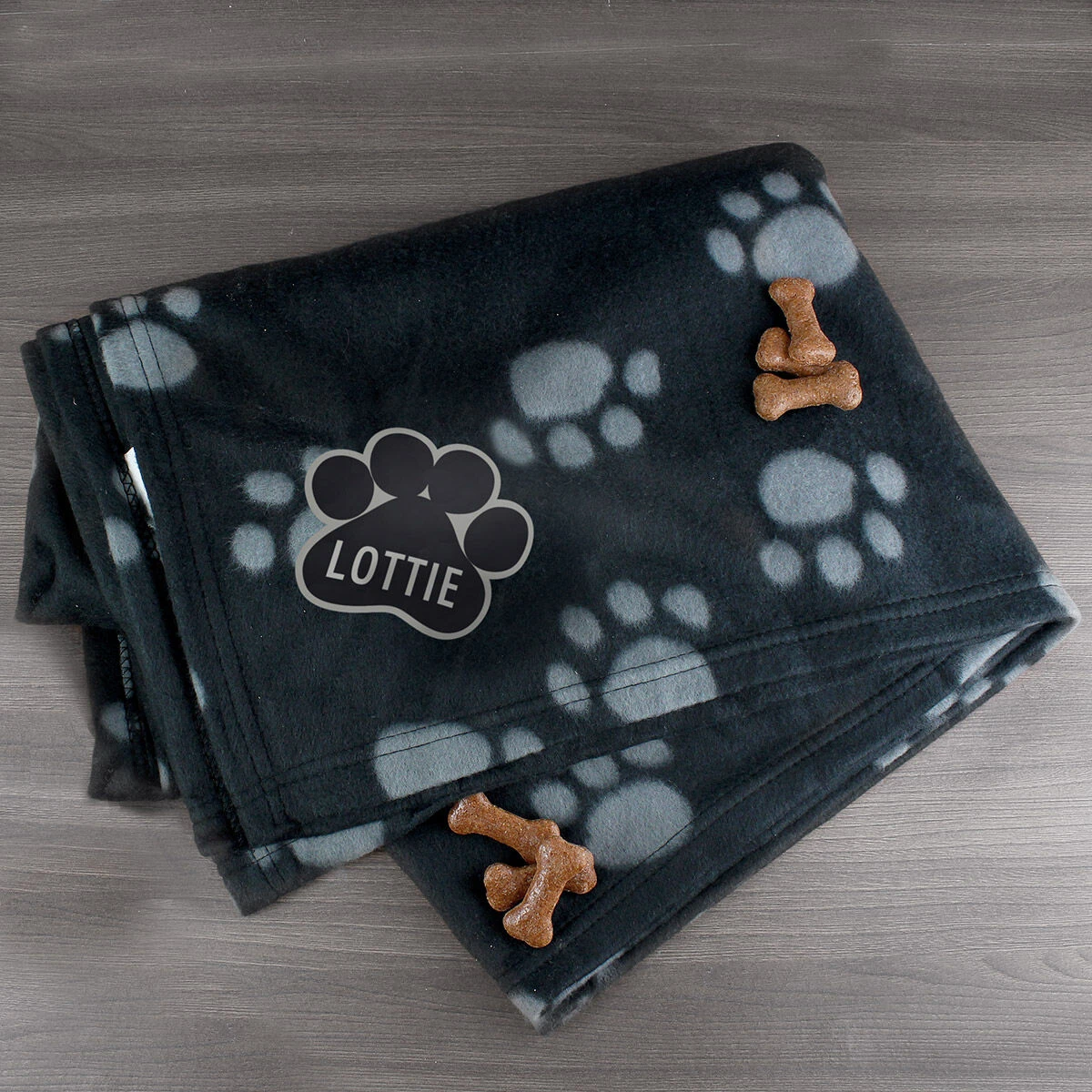 The blanket is black and features pale grey paw prints. It can be personalised with a name up to 15 characters, printed inside a doggy paw print.