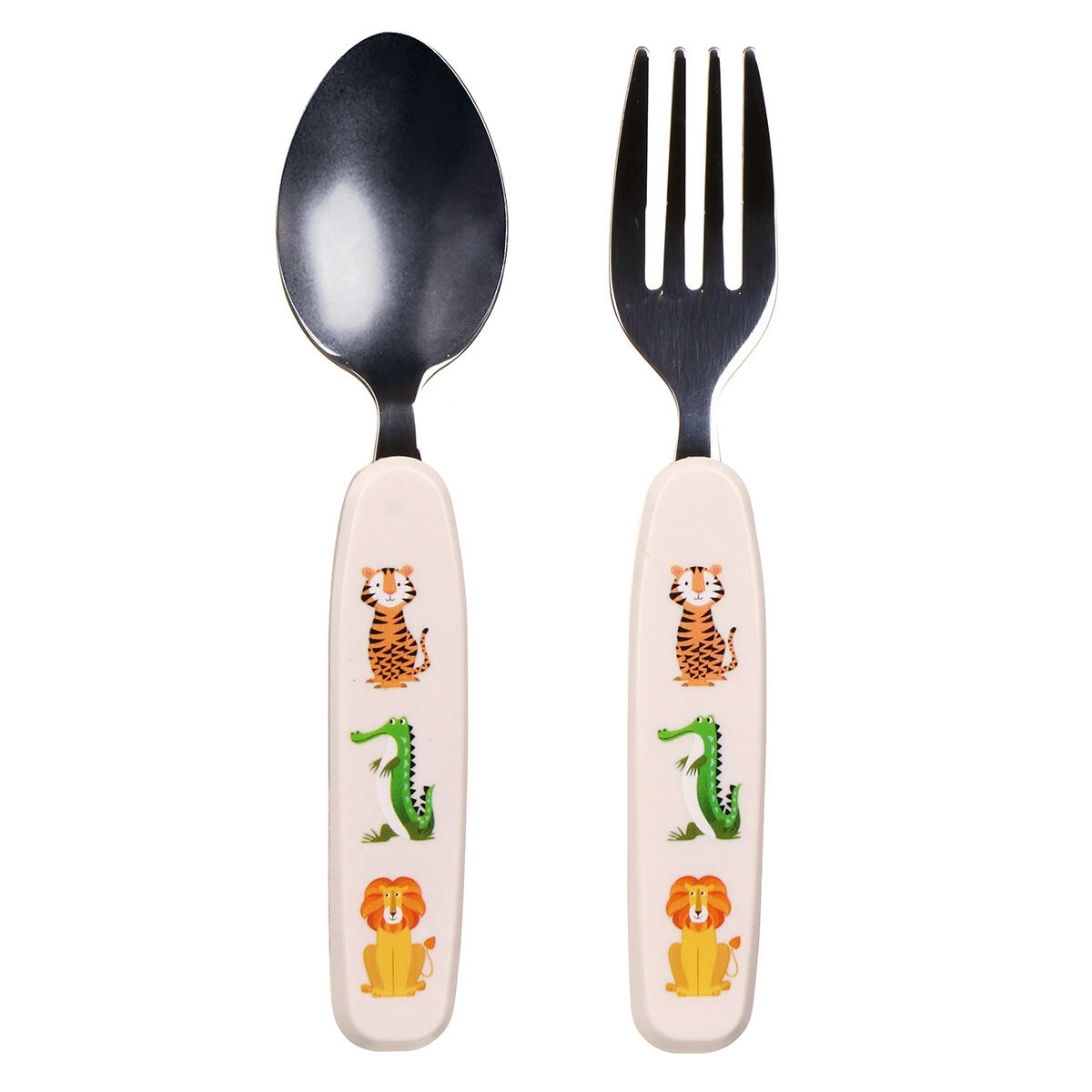 The spoon and fork, made from stainless steel feature thick plastic handles with three adorable illustrations; an orange tiger, green crocodile and yellow lion which stand out against the cream background, making the set fun and engaging.
