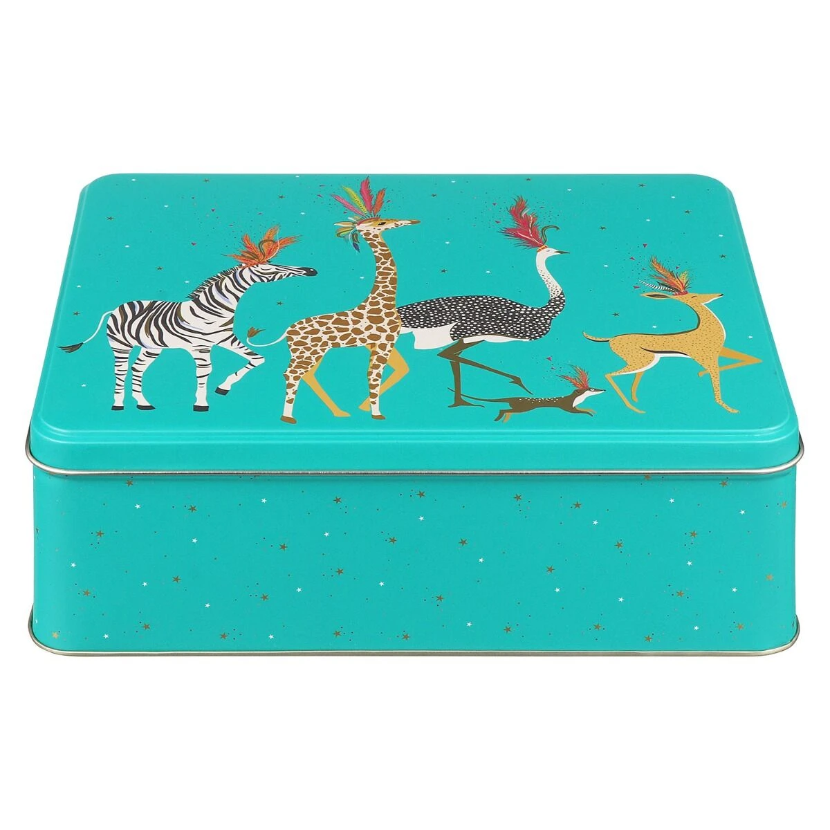 The metal tin features a parade of exotic animals such as a zebra, a giraffe, and an ostrich, wearing colourful feathered headdresses. The motif is set against a teal-coloured background scattered with gold and white stars, embellished with shimmering gold details for a touch of opulence. The lid which simply pushes on, keeping the content safe and secure.