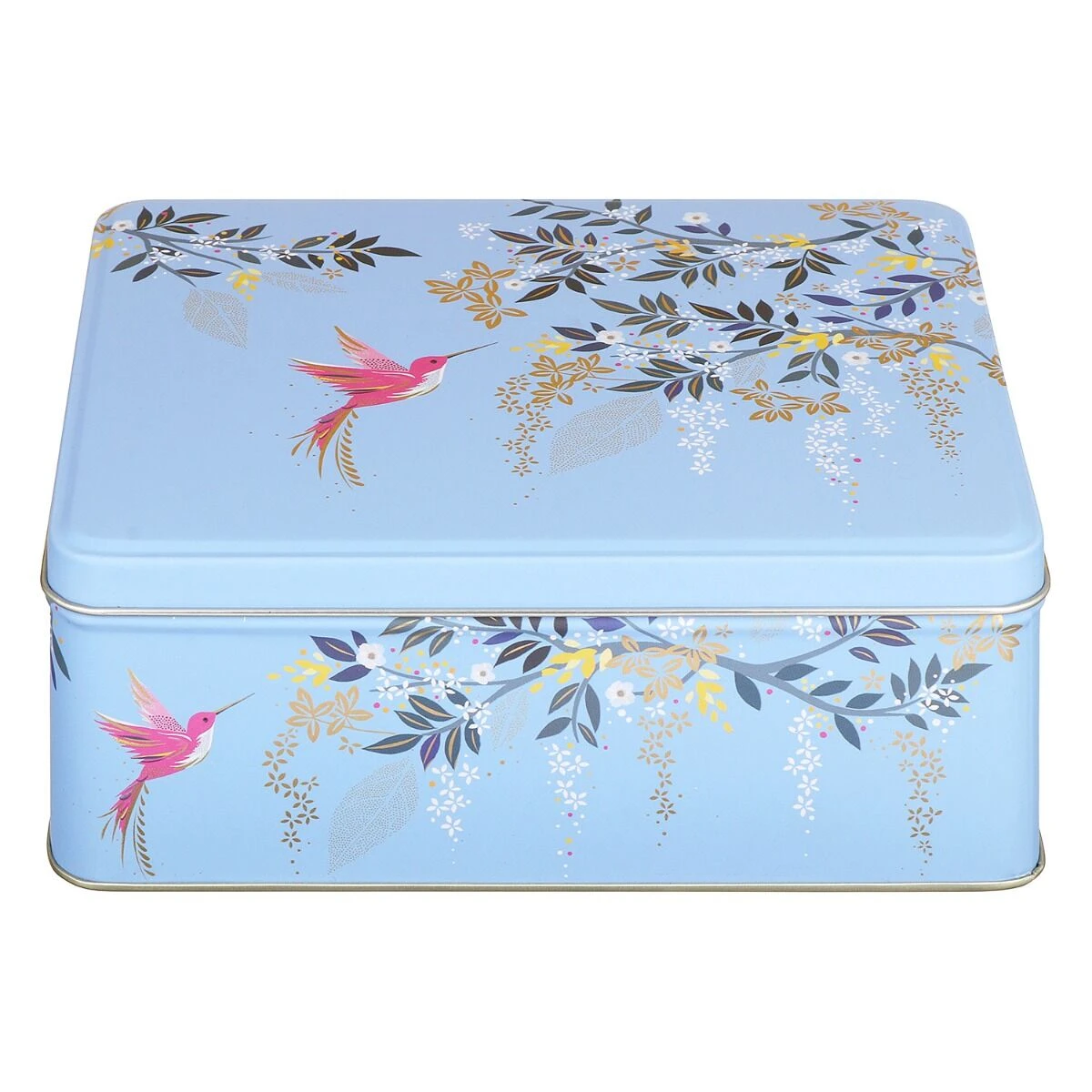 The metal tin is decorated with a pink hummingbird fluttering beside some exotic flowering plants, set against a baby blue background, and embellished with shimmering gold details for a touch of opulence. The lid simply pushes on, keeping the content safe and secure.