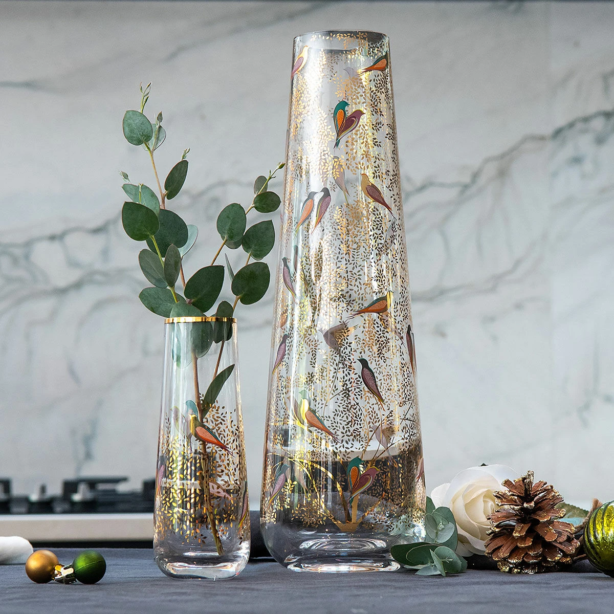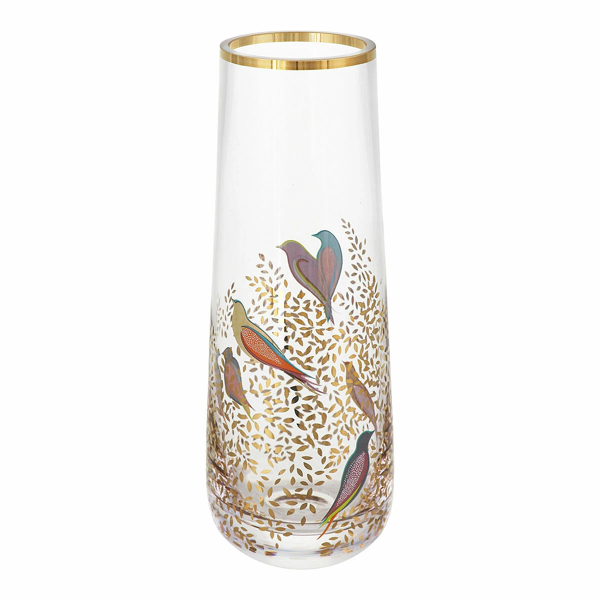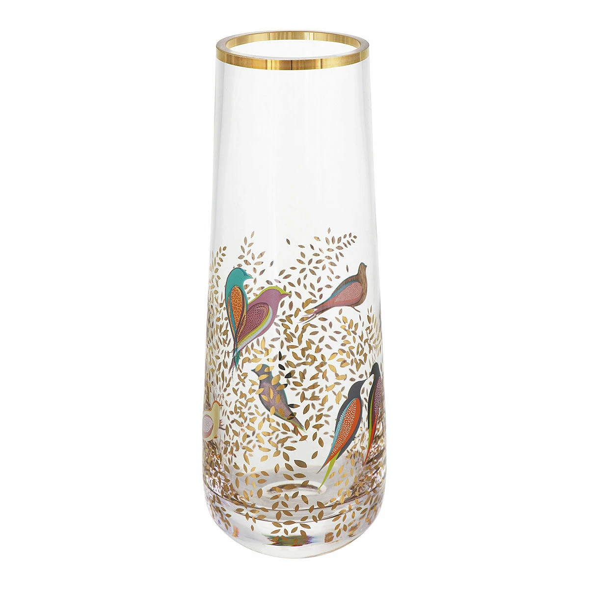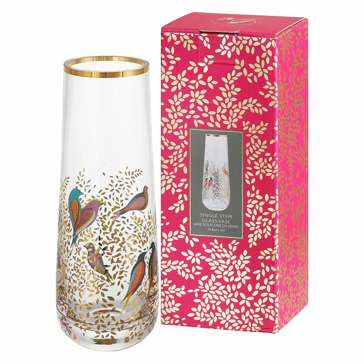 This petite vase features a narrow neck at the top, perfect for a single stem, and is decorated with the stunning Chelsea print which features a number of multi-coloured birds perched amongst golden branches which are laden with leaves. The leaves and some of the birds are embellished with 22 carat gold leaf for a decadent and stylish finish.