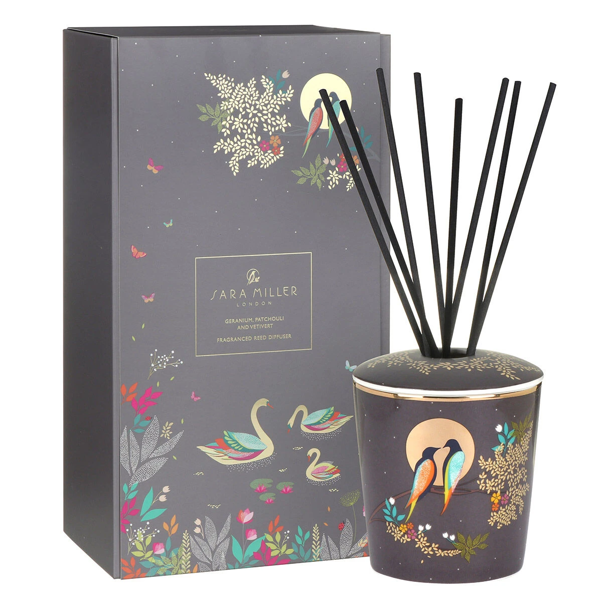 The beautiful fragranced diffuser comes in a ceramic jar which features an exquisite Chelsea design from Sara Miller; two love birds sit on a branch adorned with foliage, the branch is set in front of a golden moon and the whole image is set against a grey background representing the night sky. The sleek jar vessel is finished with 22 carat gold details including a circle around the rim and is topped with a lid featuring foliage which matches the design around the edge of the vessel completing the sophisticated piece of home decor.