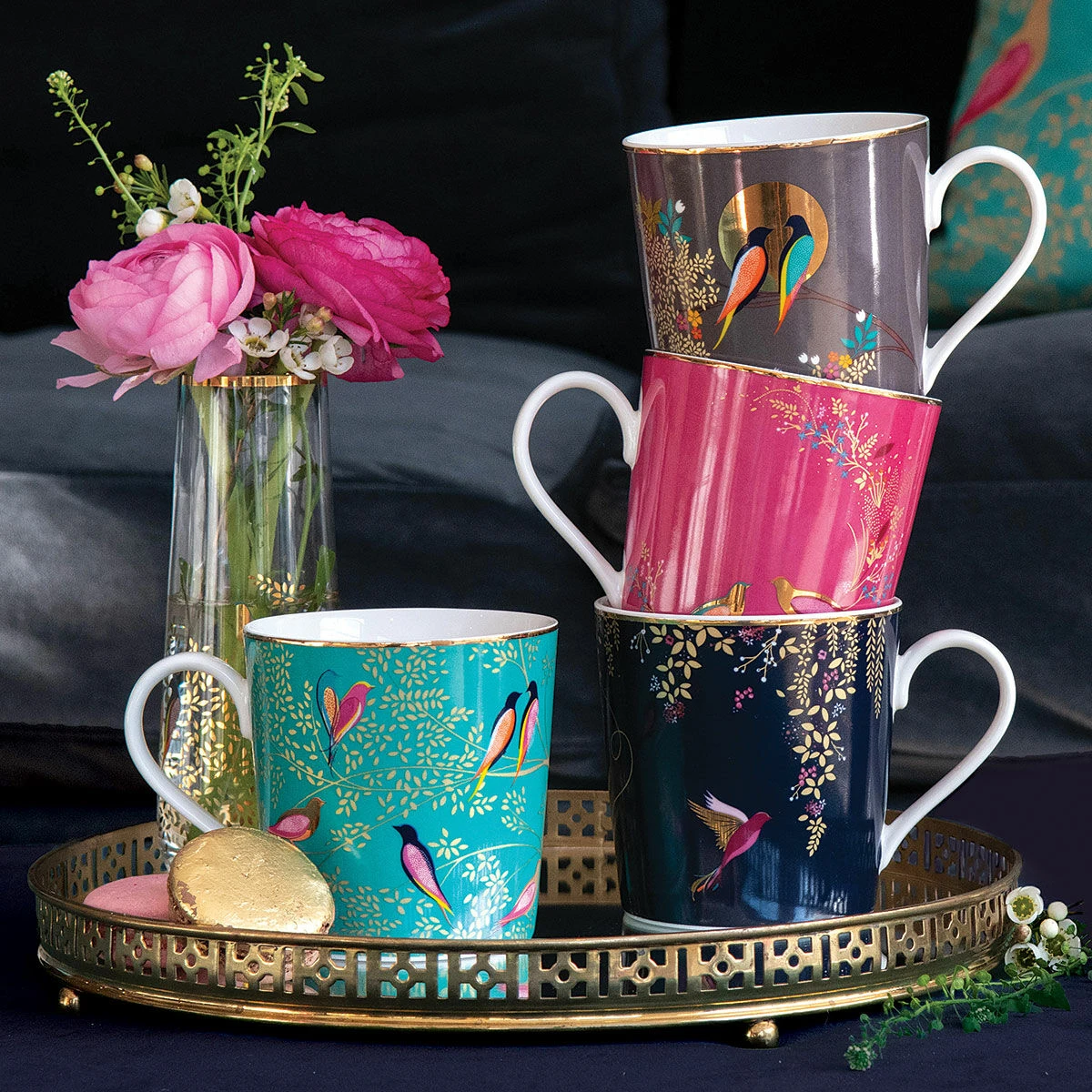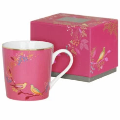 Set against a fuchsia background, a branch curves round the face of the mug and is laden with colourful flowers and golden leaves. Sat perched on the branch, two birds are depicted with their golden bodies and colourful wings. The colours contrast beautifully against each other bringing out the various tones of pink, orange and green. The handle and the inside wall of the mug are left blank which provides a nice contrast to the bold print. The gold trim around the top of the bowl and some of the birds are embellished with 22 carat gold leaf for a decadent and stylish finish.