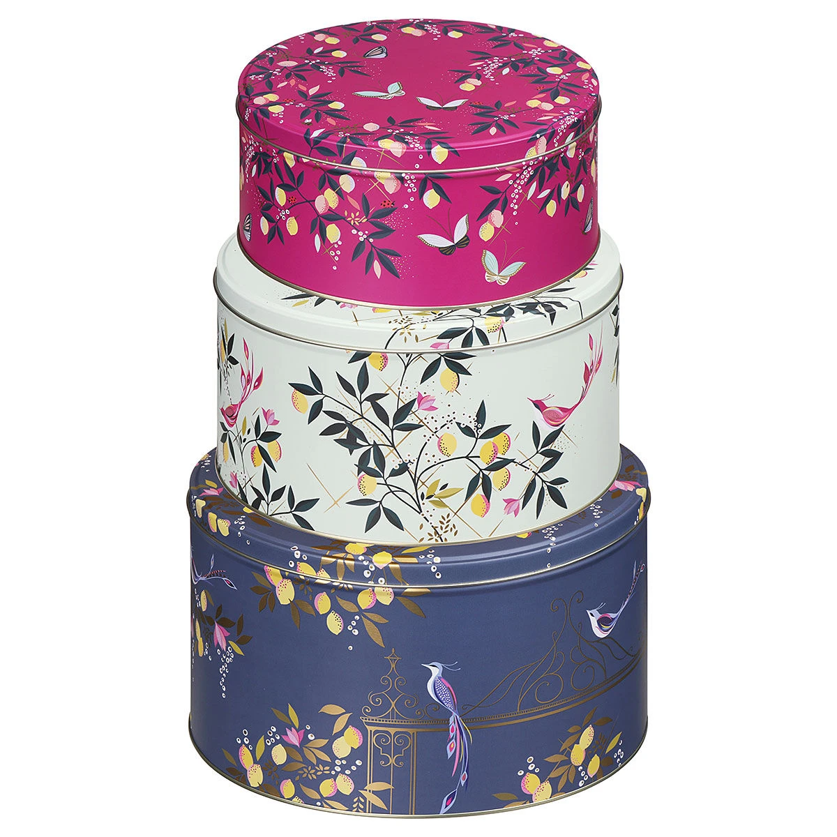 Each tin has a different colour scheme and a matte finish, one set on a duck egg background, one navy blue and one mauve pink. All the illustrations are variations on the Orchard design, which showcases elegant songbirds and butterflies settled in the branches of luscious lemon trees in an enchanted orchard garden with opulent golden gates. The tins have lids which continue the design and are secure and airtight, helping to keep your bakes fresh and tasty.