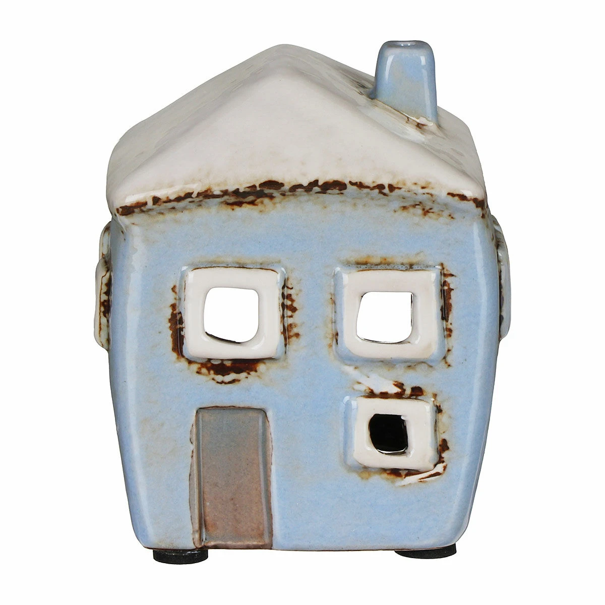 Featuring a rustic house with a beautiful blue glaze, this dainty, mini tealight holder will look lovely when displayed on a shelf or windowsill. Place a tealight of your choice inside the rear of the house and watch glow from the flame light up behind the windows of the house.