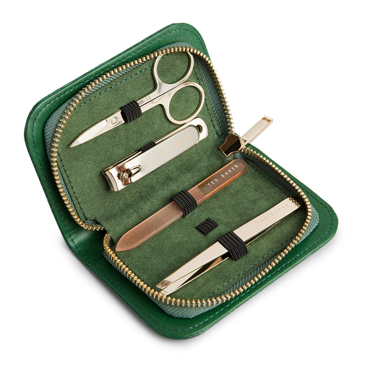 Stored in a rich green faux-leather case that is lightly embossed with a crocodile scale pattern, this set is perfect for keeping in your handbag or suitcase. Open the case up and you’ll find a 4-piece manicure set made from gold metal includes a pair of nail scissors, clippers, a nail file and a pair of tweezers, kept secure using pink elasticated loops.
