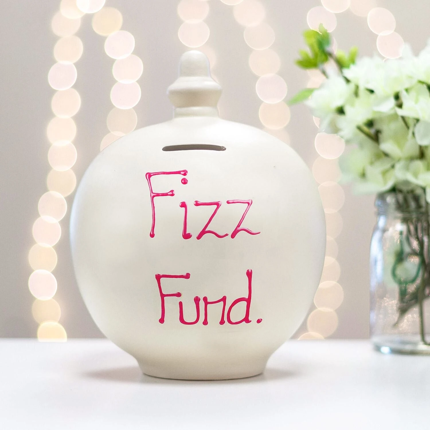 This brilliant ‘Fizz Fund’ Money Pot is the perfect way to ensure the pounds are taking care of themselves and that there is always a budget for a much needed glass of bubbles on a rainy day! The soft cream colour and beautiful pink font, reading the message ‘Fizz Fund’ ensure that this pot is a center piece to be proud of! The reverse has been left blank, and we would highly recommend personalising it to add a lovely personal touch to your pot whether it is a treat for a loved one or a gift for you!