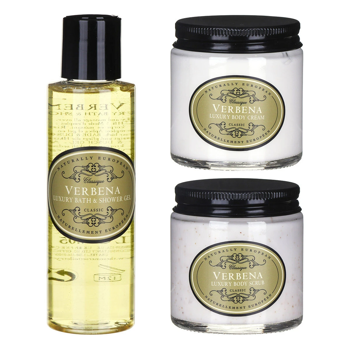 This luxury set of body care comes with 120ml of bath and shower gel to cleanse and wash yourself, 100ml of body scrub for exfoliation and 100ml of body cream to nourish and soften your skin. The set comes in a decorative gift box and each component is finished off with a label featuring the classic, vintage inspired Naturally European logo.