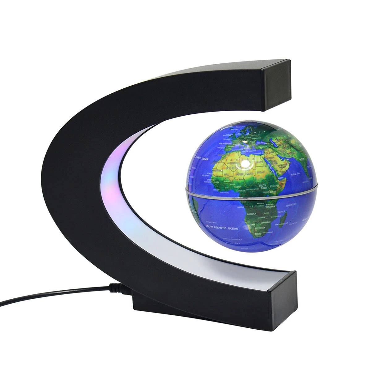 This mesmerising globe rotates in mid-air while the cradle displays a cool mix of bright LED colours. Demonstrating the extraordinary power of magnets! Using the auxiliary tool provided gently place the globe in the centre of the frame and slowly release the tool and then your hand and watch as it stays floating in the air. Give the globe a gentle push and it will rotate in mid-air.