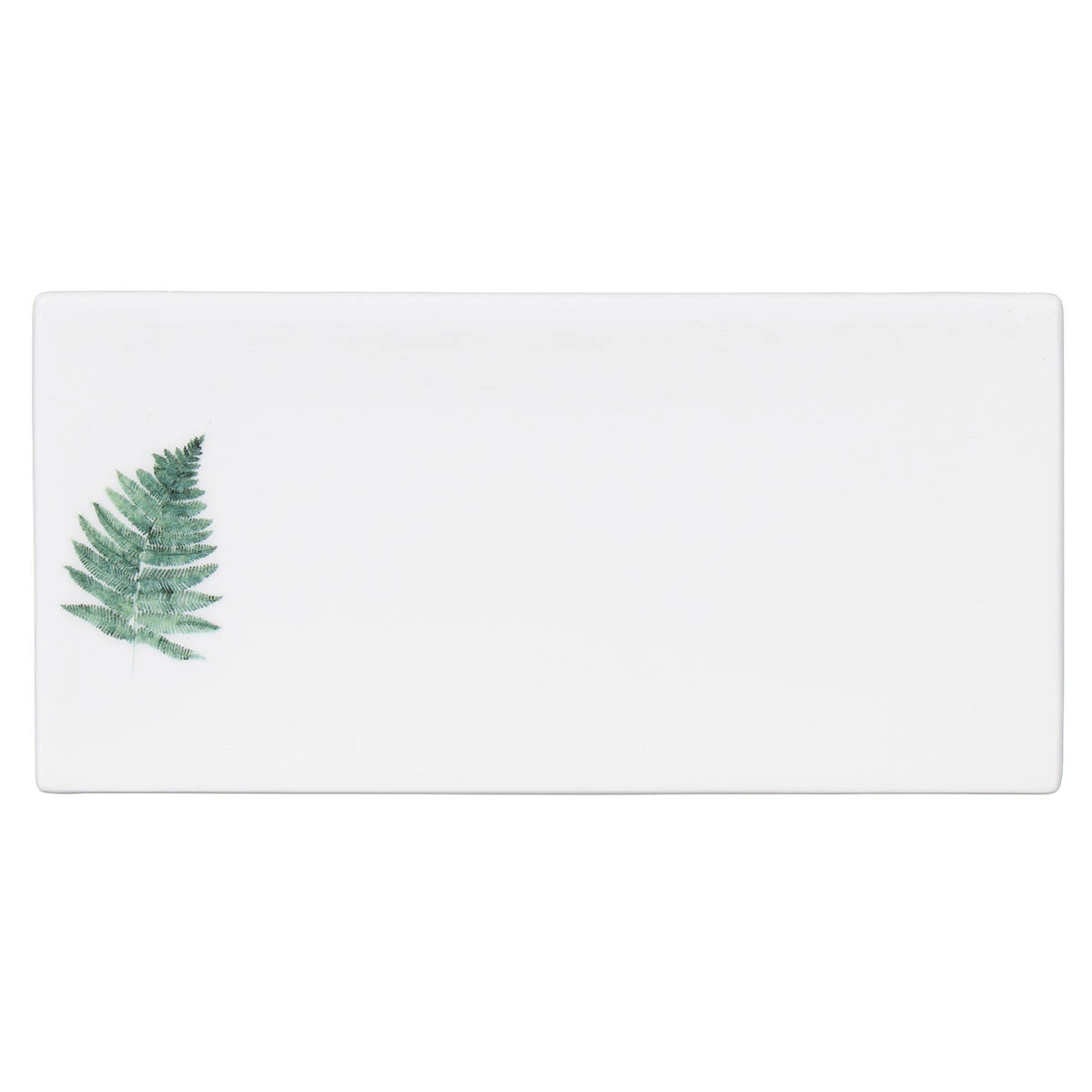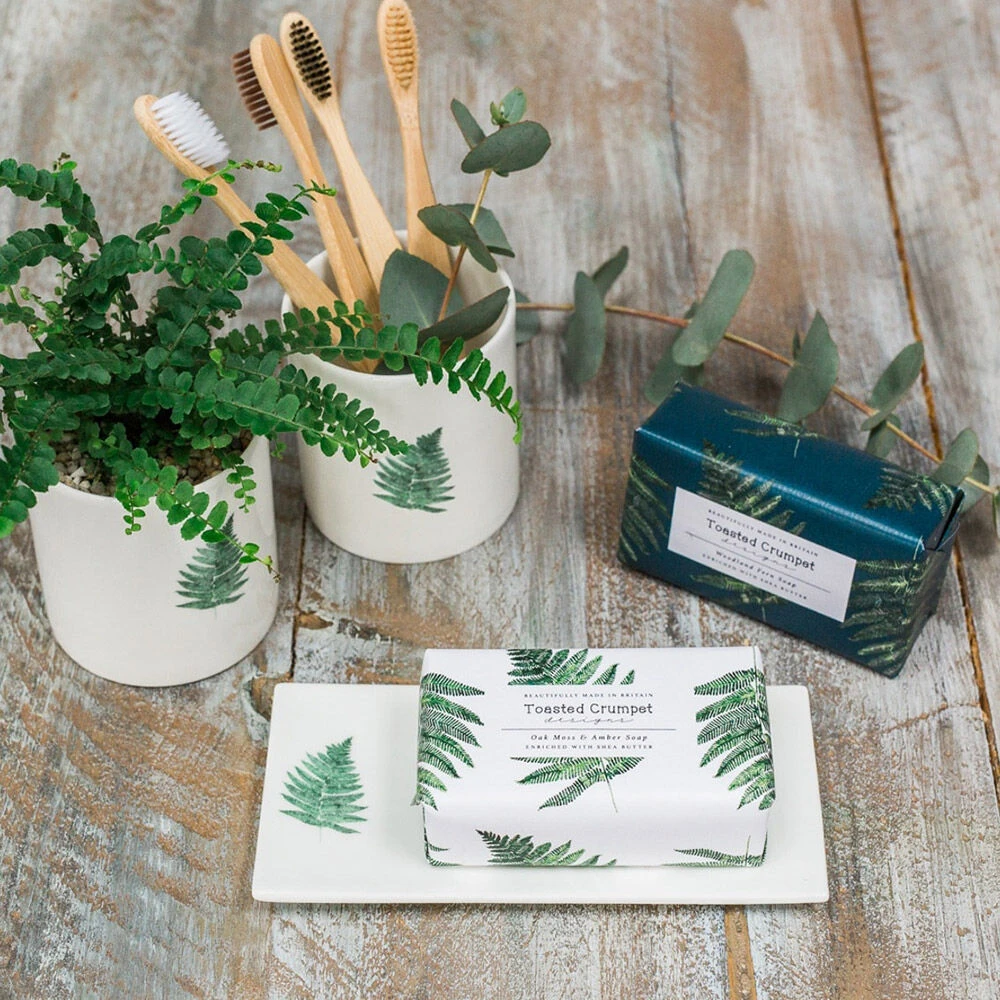The lefthand side of the soap dish features a dainty watercolour illustration of a lush green fern leaf that stands out beautifully against a crisp white background. The superb print quality captures the fine detail and vibrant colours of each hand-drawn design.