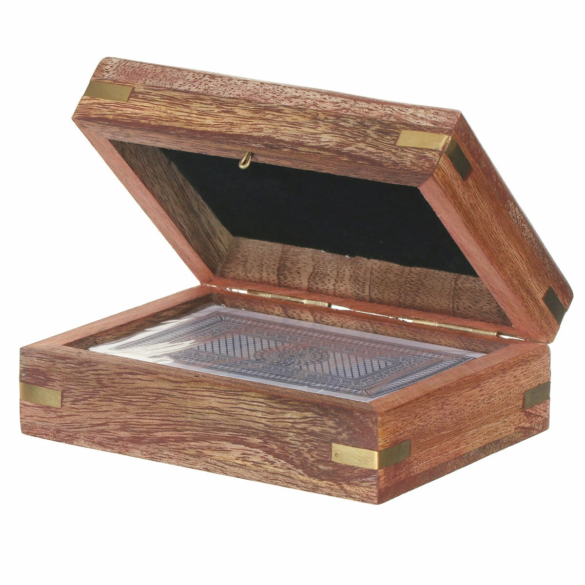 These cards are presented in a sleek wooden box with a smooth wooden finish and golden accents. Open the hinged box to reveal the pack of cards. Perfect for playing your favourite card games, such as blackjack, snap and chase the ace!
