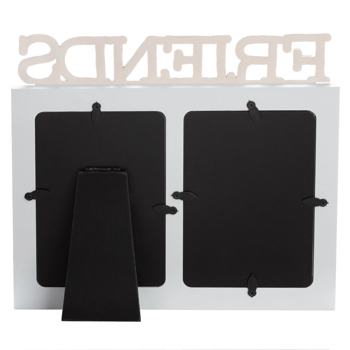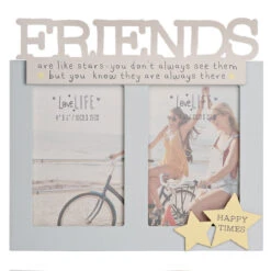 The grey-coloured, wooden frame holds two 6 x 4 portrait photographs which sits in the middle of the frame. The word ‘Friends’ sit on top of the frame written in large cream wooden letters. Beneath the text it reads ‘Are like stars – you don’t always see them but you know they are always there’. The frame contains protective glass over the spaces for your images which can be easily inserted in the opening on the reverse. The stand on the back means you can sit it on any shelf or surface top.