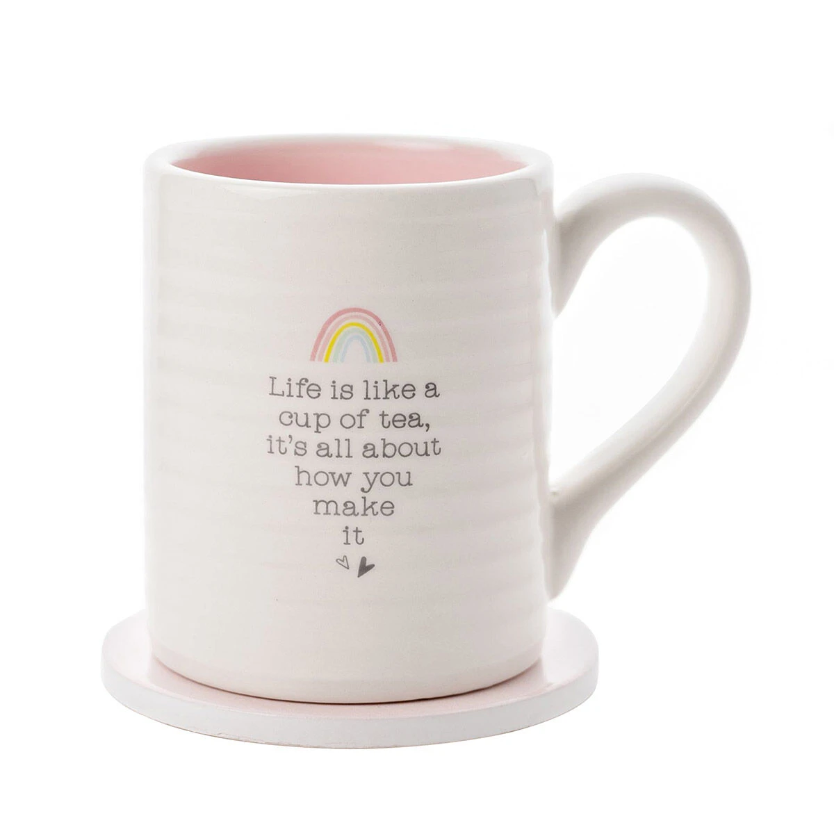 The mug and coaster both feature the same delightful design, a small colourful rainbow sits above text which reads ‘Life is like a cup of tea, it’s all about how you make it’. The mug is lightly ribbed and made of china. The inside of the mug is coloured in a light pink which matches the coaster gorgeously. The coaster has a cork backing which makes sure that it is not only non-slip but also that your furniture is protected from scratches.