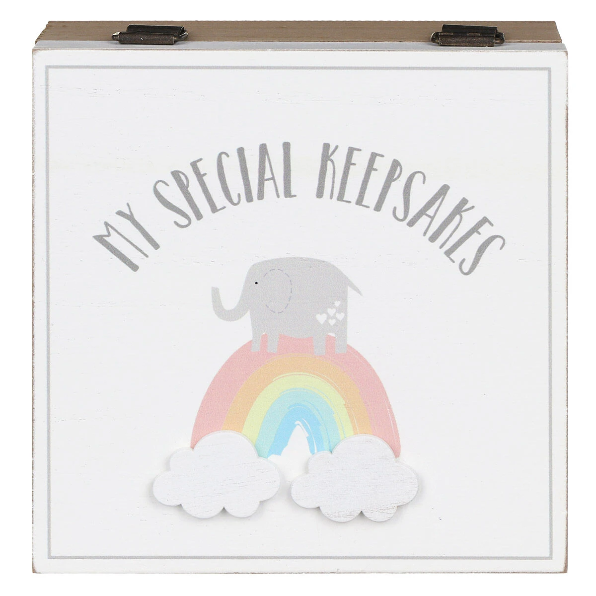 This wooden hinged box is the perfect keepsake storage solution for an array of uses. The lid of this keepsake box is decorated with an adorable elephant stood on a rainbow and text that reads ‘My Special Keepsakes’. The lid also features a wooden heart attached to a piece of twine.