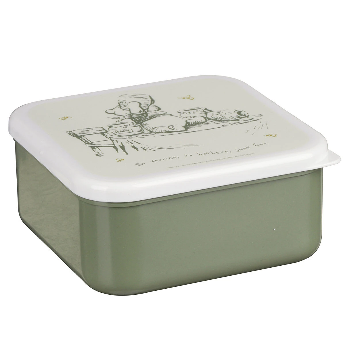Perfect for sandwiches, fruits, or crackers this lunchbox set features 3 sizes of plastic tub which nest one inside the other, taking up limited space in the cupboard when not in use. Each plastic pot features a different classic Winnie The Pooh illustration, a grey outline drawing set against a coloured background on the white lid, finished with a little phrase on two of them ‘No worries, no bothers, just fun’ and ‘Happy thoughts’. Each pot is either olive green or yellow which complement the design of the charming character.