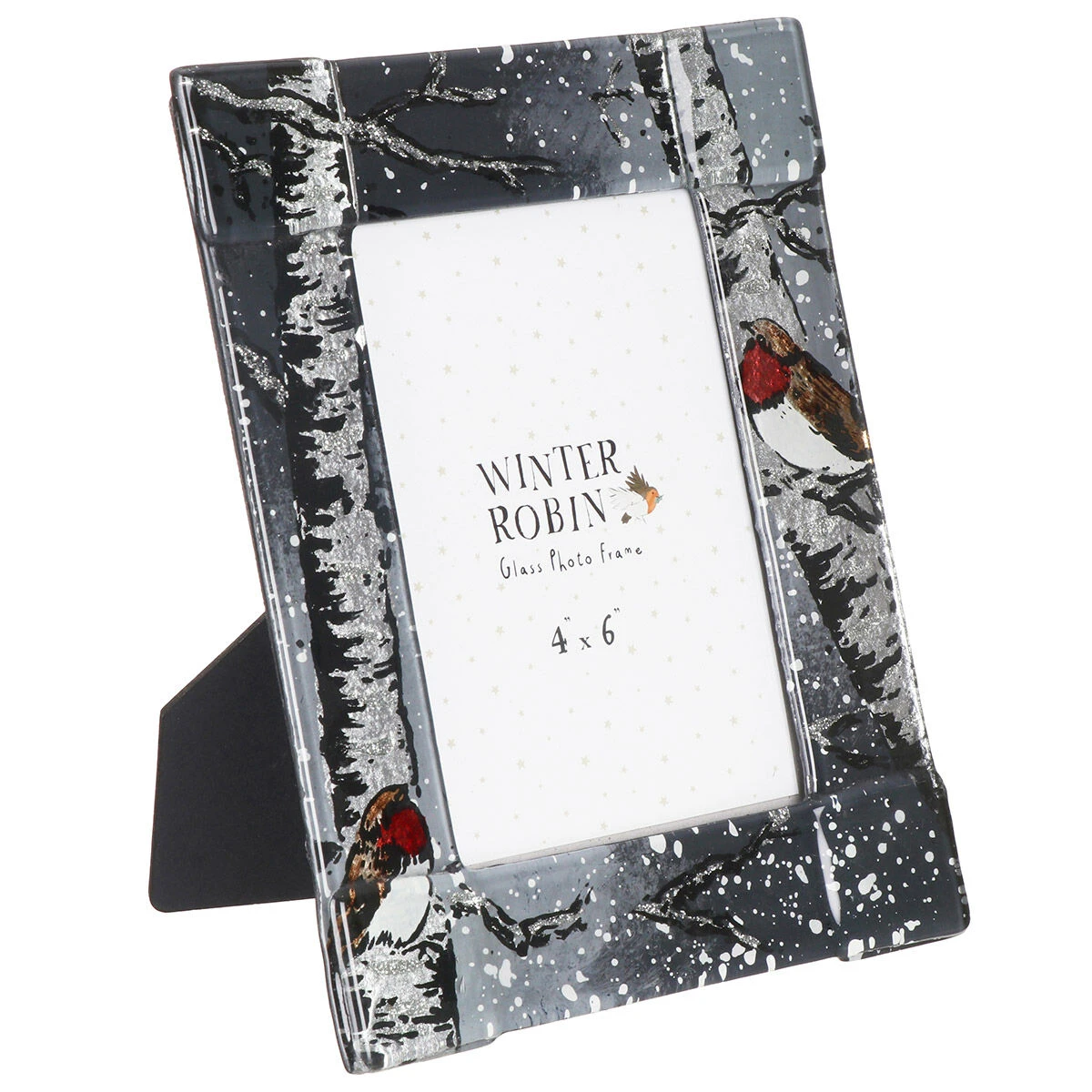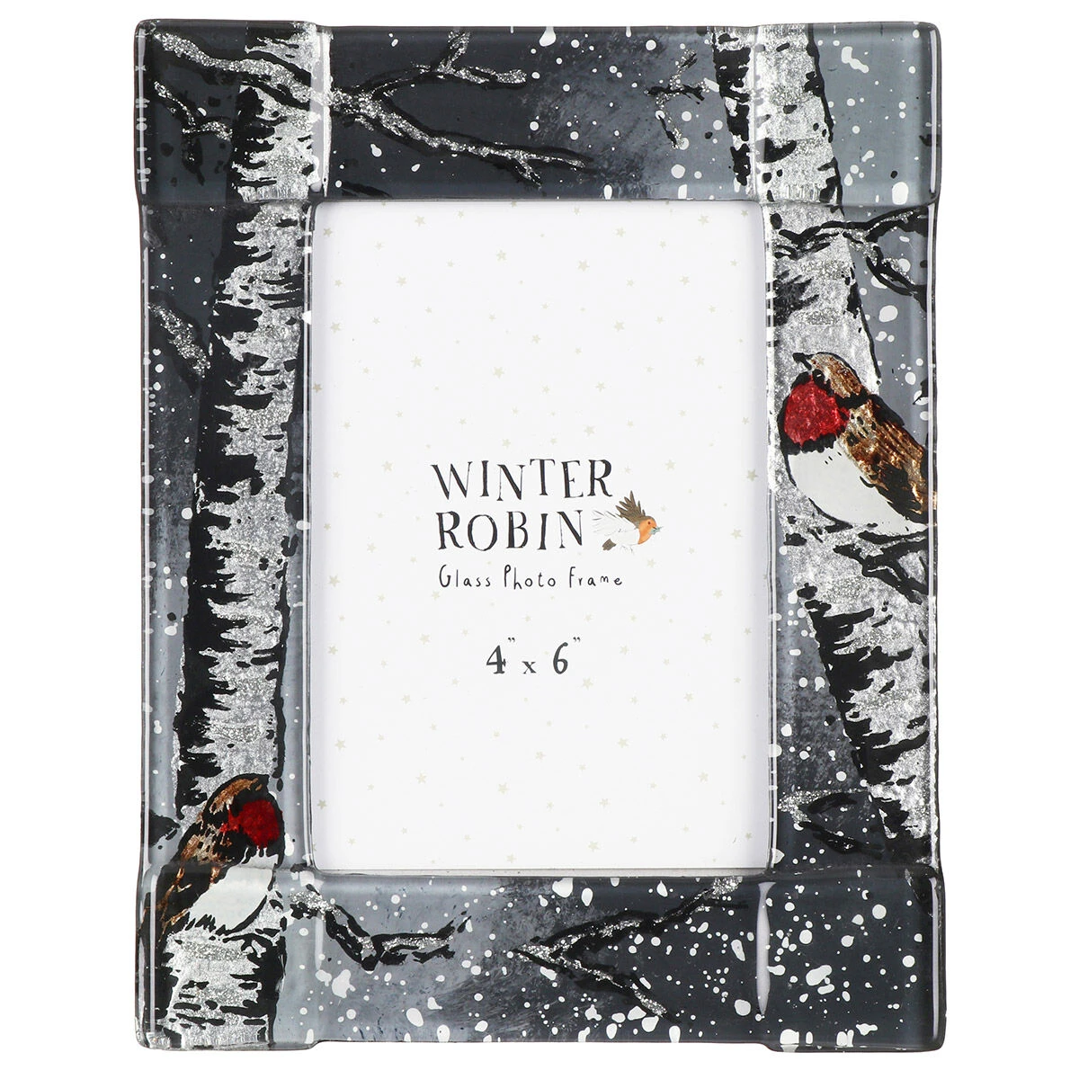 The glass frame is beautifully embellished with silver glitter and metallic silver paint that sparkles in the light. It is decorated with artistically painted robins sitting on branches amidst a snowy backdrop. The colouring is reminiscent of a stained-glass window with glittery silvers accentuating the bright red and deep browns.