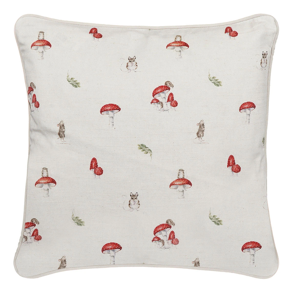On the reverse of this cushion is an array of mouse and mushroom themed illustrations, displayed in a polka dot fashion across the beige canvas backdrop all in different poses and interspersed with small white dots. The cushion is finished off with a pied edge, a concealed zip fastening and the Wrendale branded tag.
