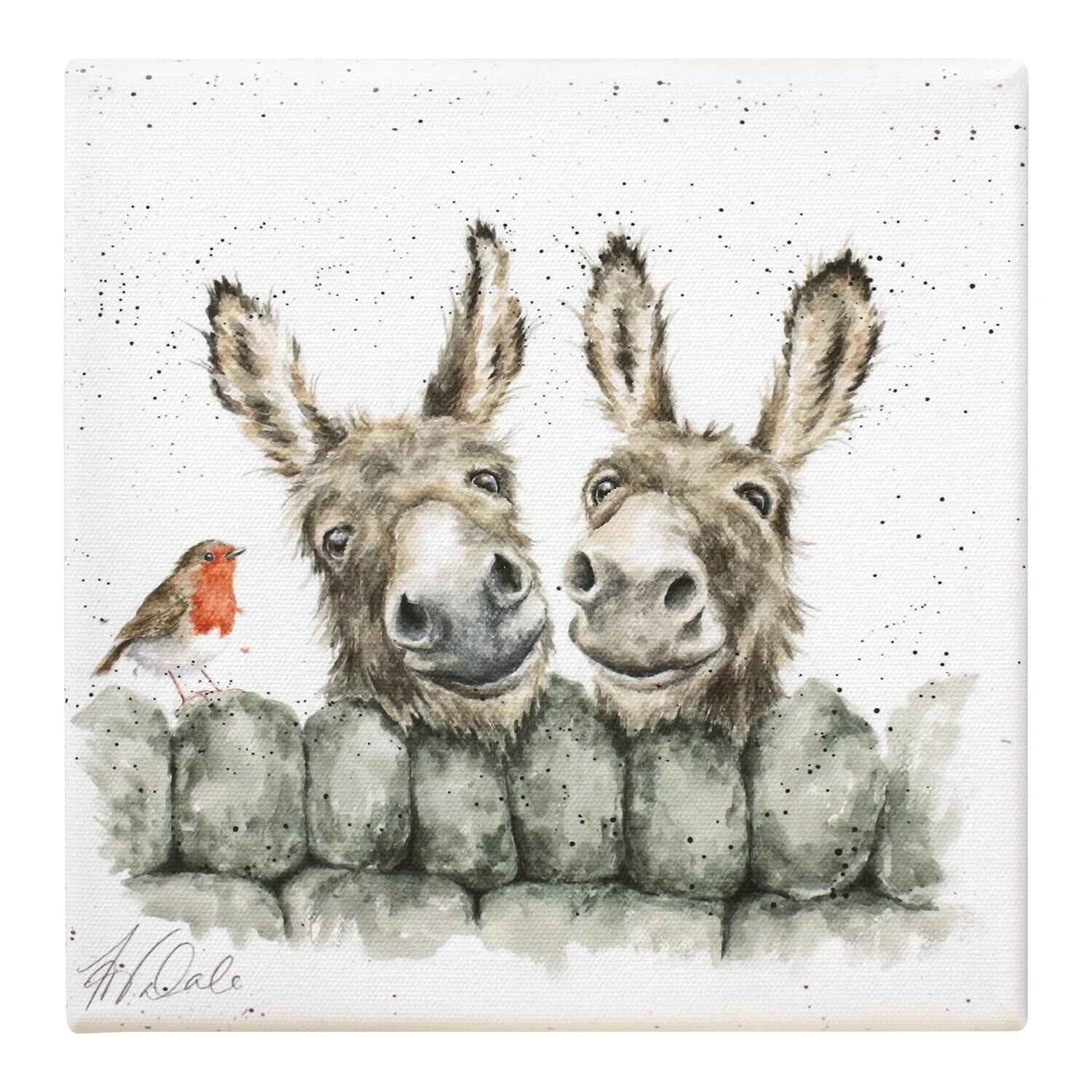 Set against a crisp white canvas, this painting features a pair of adorable donkeys with cheeky grins peering over a stone cobbled wall. Perched on the wall beside them is a gorgeous little robin bird. The intricacy and detail of this piece of art will look wonderful hung on any wall.