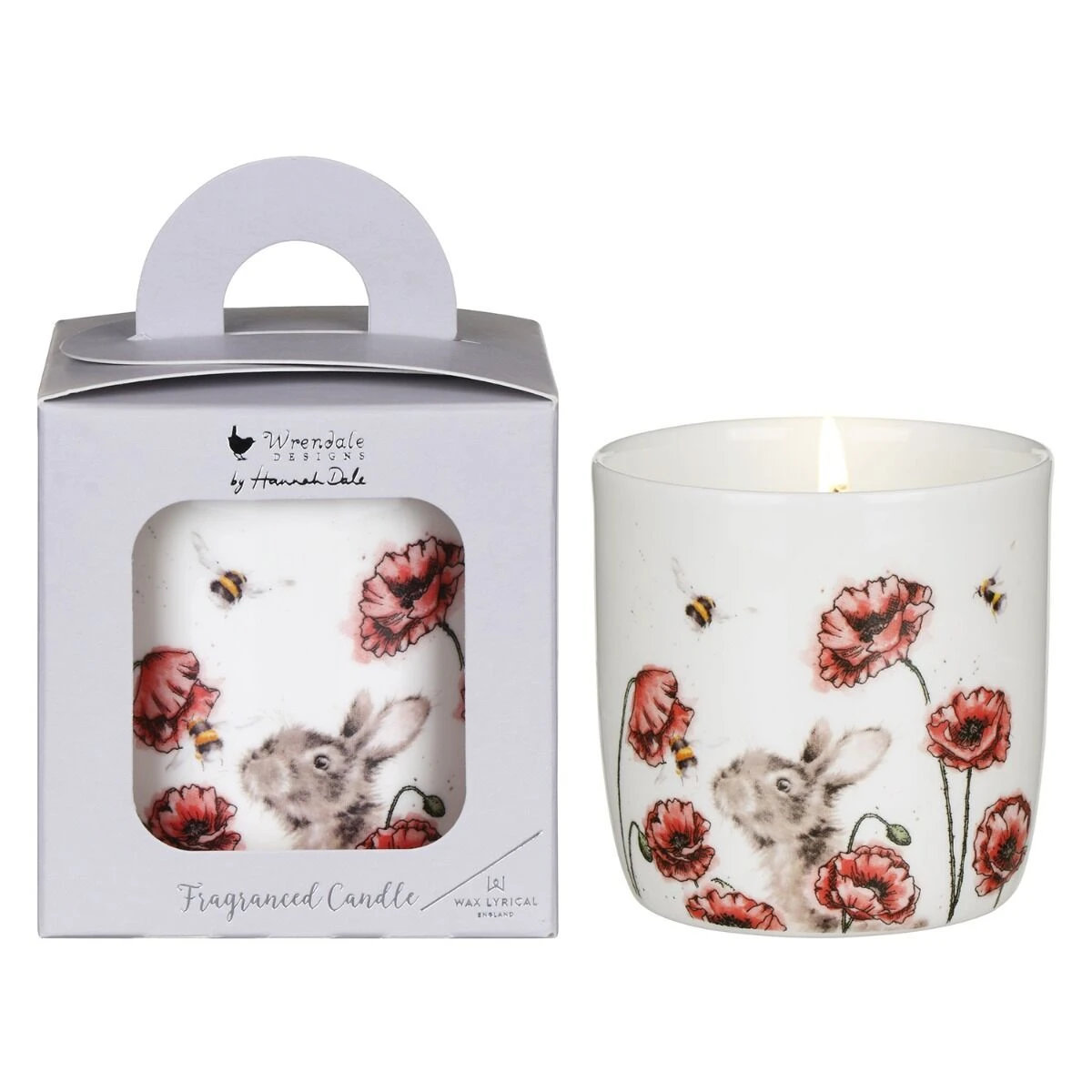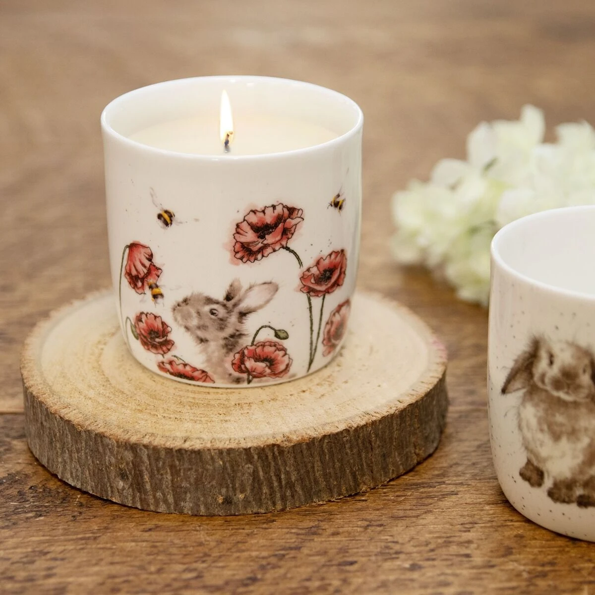Made of ceramic, this candle depicts dainty bumblebees hovering above a meadow of rich red poppies, painted in soft watercolour tones, in the signature style of Wrendale Designer, Hannah Dale. Sat observing the bees as they buzz around, and work is an inquisitive rabbit. This is all set against the crisp cream background. Around the bunny are interspersed speckles of black paint, in a way that is very synonymous with the Wrendale brand.